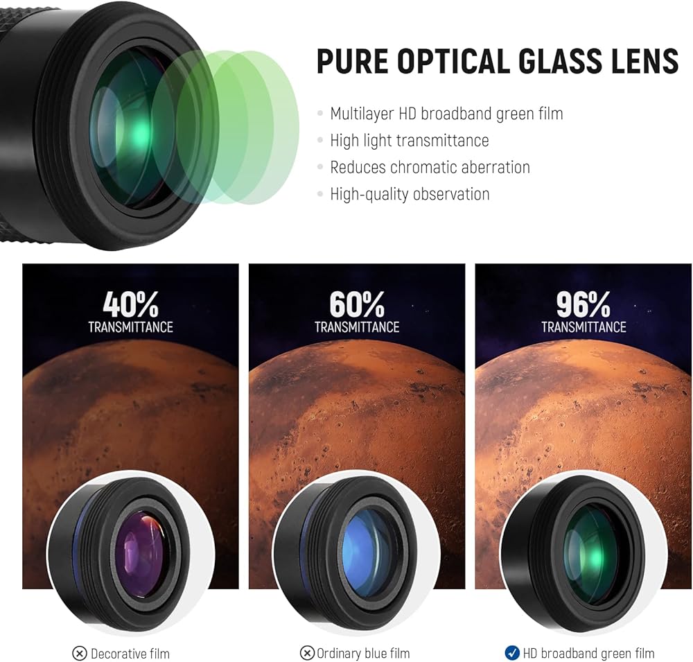 【0.25 بوصة PL 25 مم العدسة】تتميز عدسة بلوسل العالمية 1.25 بوصة (PL) بحجم 25 مم بدقة عالية ويمكن أن تزيد من التكبير للتلسكوب. ملولب بالكامل لتقليل الانعكاسات؛ يقلل من تناثر الضوء المتناثر. يوفر أوسع مجال للرؤية بالإضافة إلى وضوح إضافي وتخفيف طويل للعين