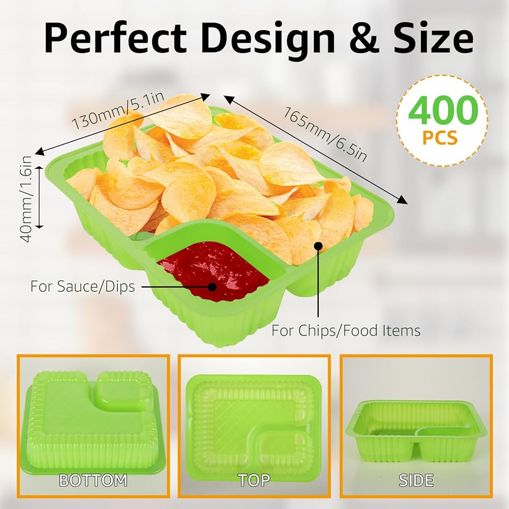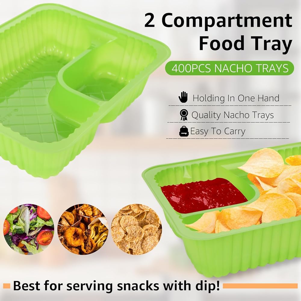 【عبوة قيمة رائعة】-- تأتي عبواتنا القيمة مع 400 قطعة من صواني ناتشو البلاستيكية الخضراء المكونة من جزأين. يمكن أن تحتوي المقصورات الكبيرة على 9.7 أونصة ويمكن أن تحتوي المقصورات الصغيرة على 2.4 أونصة بسعة إجمالية تبلغ 12.1 أونصة. الأبعاد تقريبًا 8 بوصات طول × 6 بوصات عرض × 1.5 بوصة ارتفاع. بكميات كافية لتلبية احتياجاتك المختلفة، ومناسبة للاستخدام اليومي والحفلات. عند عدم الاستخدام، يمكن تكديسها وتخزينها دون أن تشغل مساحة كبيرة.