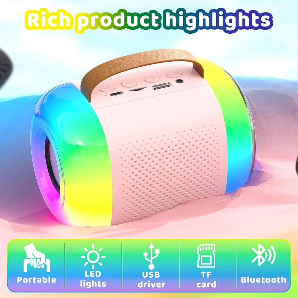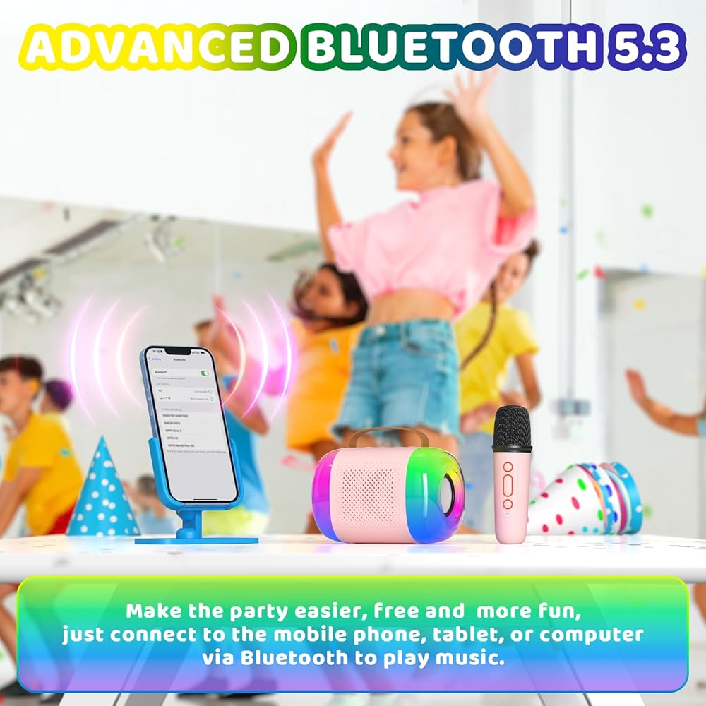 تفاعلية ومسلية: تأتي آلات الكاريوكي للأطفال مزودة بمصابيح LED ملونة مدمجة لتعزيز قيمة الترفيه. يمكن لآلة الكاريوكي للأطفال هذه أن تجعل جلسات الغناء أكثر متعة وغامرة للأطفال. يحتوي الميكروفون اللاسلكي للأطفال على تأثيرات تغيير الصوت. تضمن شريحة Bluetooth 5.3 المدمجة الاقتران الفوري والسريع وتحافظ على اتصال مستقر يصل إلى 33 قدمًا. يمكن لمكبر صوت Bluetooth اللاسلكي إعادة الاتصال تلقائيًا بالجهاز الأخير المستخدم.