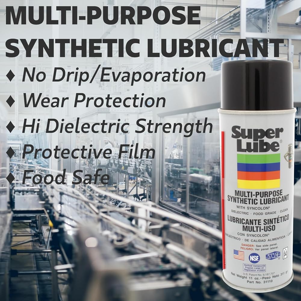 Super Lube® Multi-Purpose Synthetic Lubricant with Syncolon® is a multi-purpose grease in an aerosol form that is safe to use on anything that slides, rolls, swivels or squeaks. It is a synthetic, heavy duty lubricant that provides superior wear protection. It penetrates, lubricates and extends the life of machinery and equipment. It provides excellent oxidation resistance and rust protection. NSF registered Food Grade lubricant, rated H1 for incidental food contact, meets USDA 1998 H1 Guidelines.