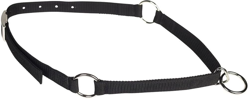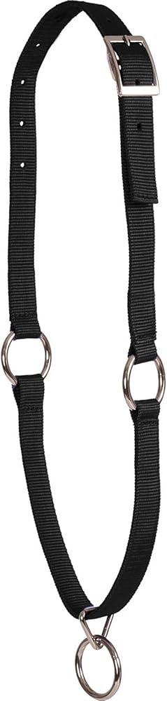Mustang Neck Collar 1" Wide poly webbing collar with nickel plated buckle and ring. Neck collar has a suggested use with a picket line and swivel snap lead. Collar can also be used with a supervised cross-tie for ease of grooming, washing and trimming. 44" long. Available in horse size only.
