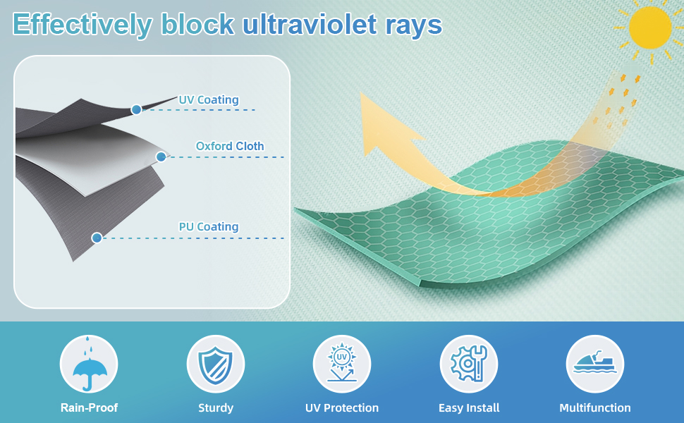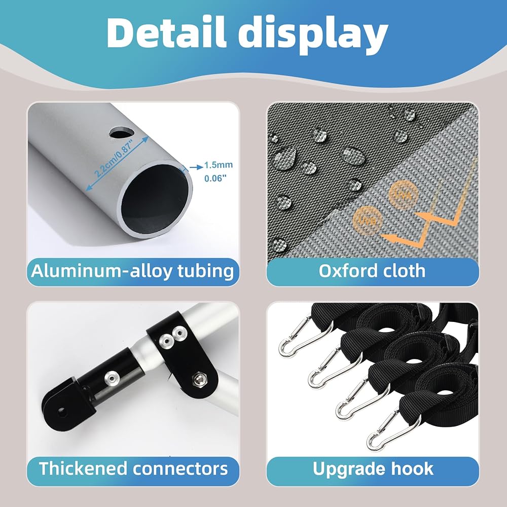 القماش: قماش أكسفورد عالي القوة + طلاء من البولي يوريثان + طلاء للأشعة فوق البنفسجية، مقاوم للماء، ومضاد للأشعة فوق البنفسجية ومضاد للبهتان.