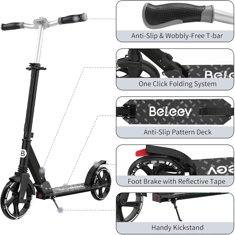 مزيج من ميزات الأمان والمريحة: نحن نضع سلامة الجميع في الاعتبار، حيث يتيح لك السكوتر الخاص بنا التجول بسهولة بفضل سطحه المتين والقوي الذي يدعم الدراجين حتى وزن 220 رطلاً. توفر المقابض المطاطية راحة إضافية وثباتًا ثابتًا. يوفر قفل T-bar قيادة ثابتة وآمنة، ولن تشعر باهتزاز المقود حتى على الأرصفة غير المستوية. مكابح موثوقة لإيقاف السكوتر بسرعة وسهولة.