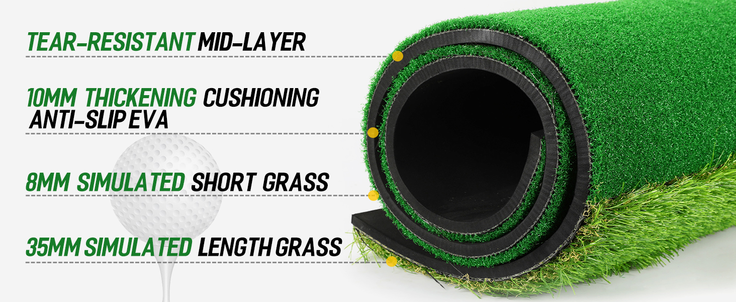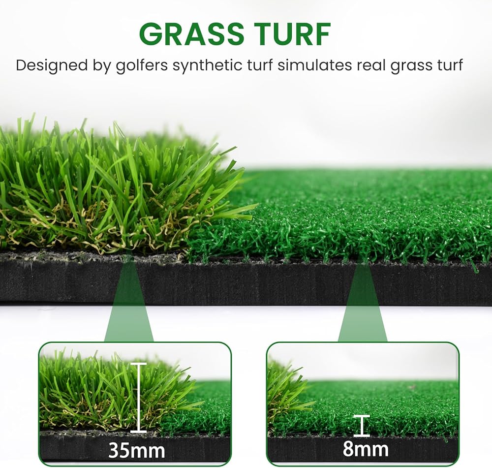 【العشب الاصطناعي المزدوج】- تتميز سجادات تدريب الجولف لدينا بتصميمين للعشب، مما يوفر مزيجًا من العشب الطويل والقصير لتعزيز المهارات المختلفة. يبلغ ارتفاع العشب القصير 8 مم، والعشب الطويل 35 مم. تحاكي سجادة الجولف إحساس العشب المشذب بدقة بعشبها القصير، بينما يحاكي العشب الأطول ظروف العشب الصعبة.