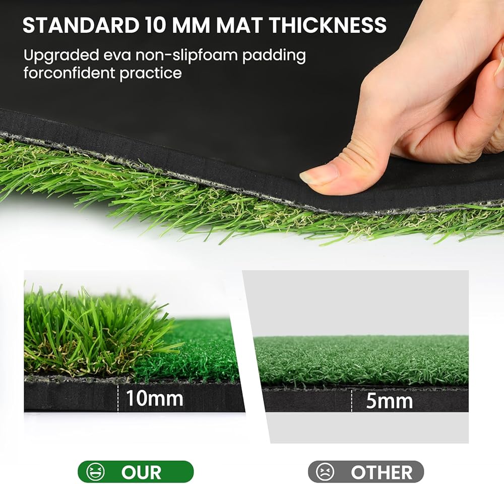 【سجادة ضرب الجولف بسمك 10 مم】- تتكون القاعدة من طبقة وسادة مطاطية إسفنجية متينة عالية المرونة من مادة إي في إيه غير قابلة للانزلاق. تستخدم سجادات الجولف الخاصة بنا للتمرين في الهواء الطلق طبقة متكاملة مضادة للتمزق لتحسين قوتها ومتانتها لضمان مقاومة التمزق والاستخدام طويل الأمد. لن تنزلق أو تتمزق أثناء التأرجح المتكرر، مما يجعلها قوية بشكل استثنائي وتدوم طويلاً.