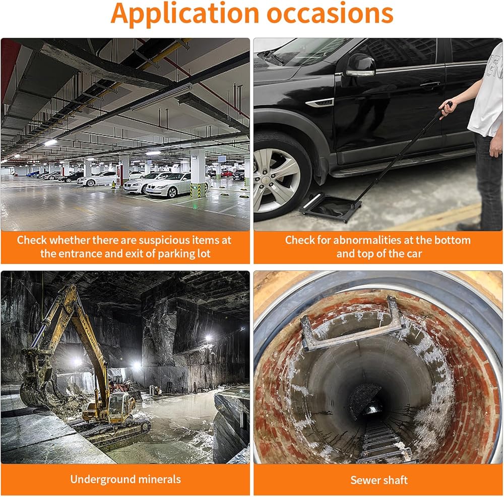 This is a very popular safety inspection mirror under the car, 30CM large square convex mirror, high-power high-light white LED light, rechargeable battery. Economical and portable, simple and clear, with four supporting wheels, easy to push, a large range of rod activity, suitable for different angles of space, is a widely used in checking cars, tables, stools and other bottom of the abnormal security tools