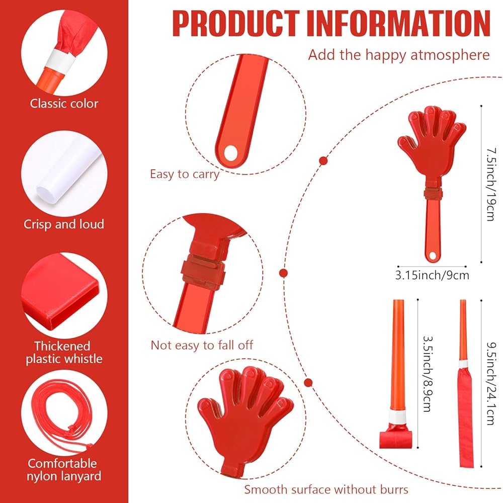 الحجم المناسب: يبلغ قياس كرات التشجيع الخاصة بنا حوالي 24 سم / 9.6 بوصة في طول كرات البوم، وحوالي 8 سم / 3.2 بوصة في طول المقبض، ويبلغ قياس عصي الرعد حوالي 60 × 10 سم / 24 × 4 بوصة، وحجم المصفق اليدوي للعبة يبلغ طول الصافرة العادية حوالي 19 سم/ 7.5 بوصة، ويبلغ طول الصافرة العادية حوالي 4.6 × 1.5 سم/ 1.81 × 0.59 بوصة، والجزء البلاستيكي من الصافرة المخفوقة 6.5 سم/ 2.56 بوصة، والسلك المعدني حوالي 10 سم/ 3.94 بوصة؛