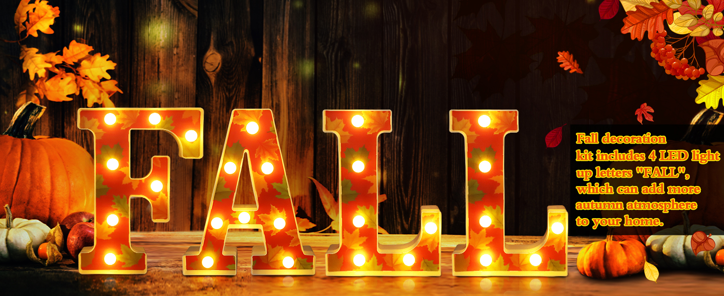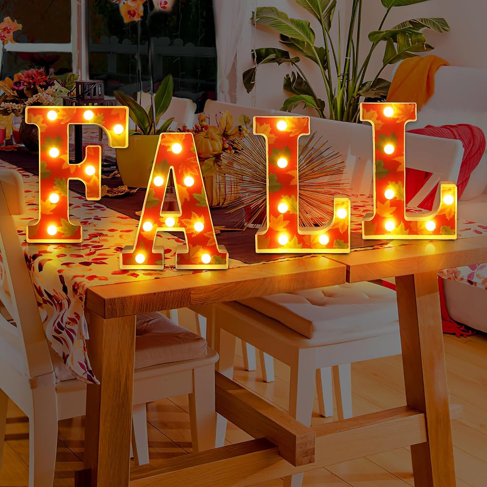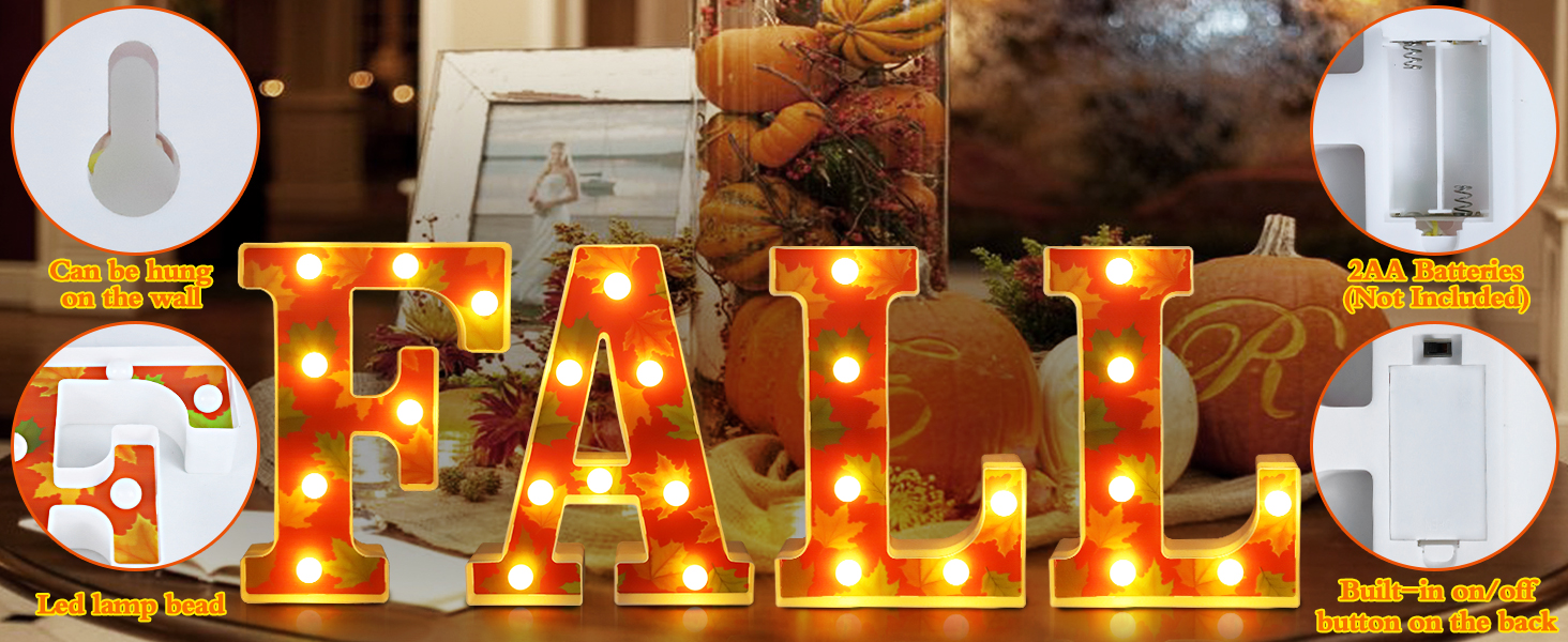 تتضمن العبوة 4 حروف مضيئة LED "FALL" مع أوراق القيقب مطبوعة عليها. سوف تضفي البهجة على حفلتك المنزلية في الخريف وتجلب المزيد من السعادة في عطلة عيد الشكر هذا الخريف.