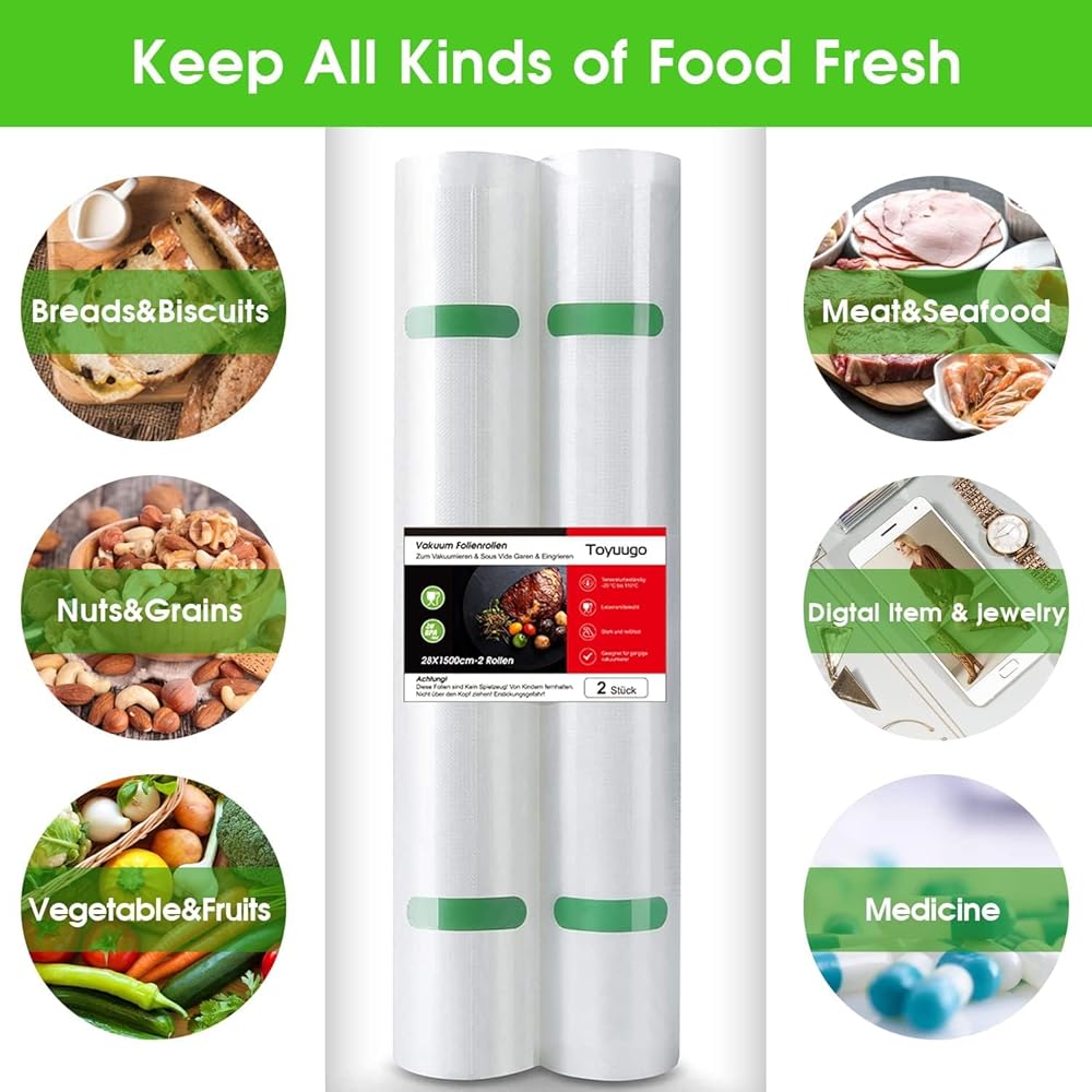 → GREAT VACUUM COMPATIBILITY: These compact vacuum sealers measure 28cm (W) x 3m (L) per roll for a total of 6m. They are compatible with many vacuum sealants, especially some with built-in cutters. Works perfectly with vacuum sealers.