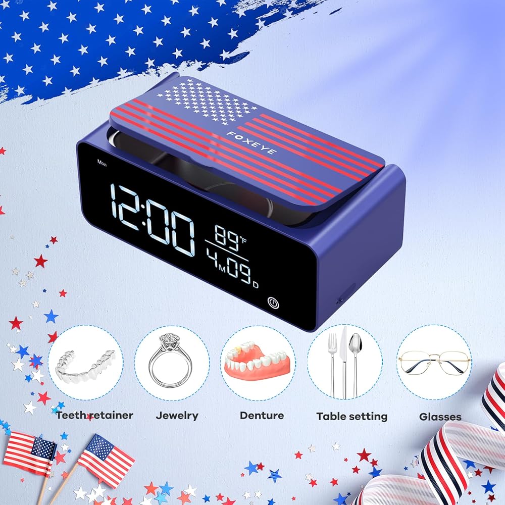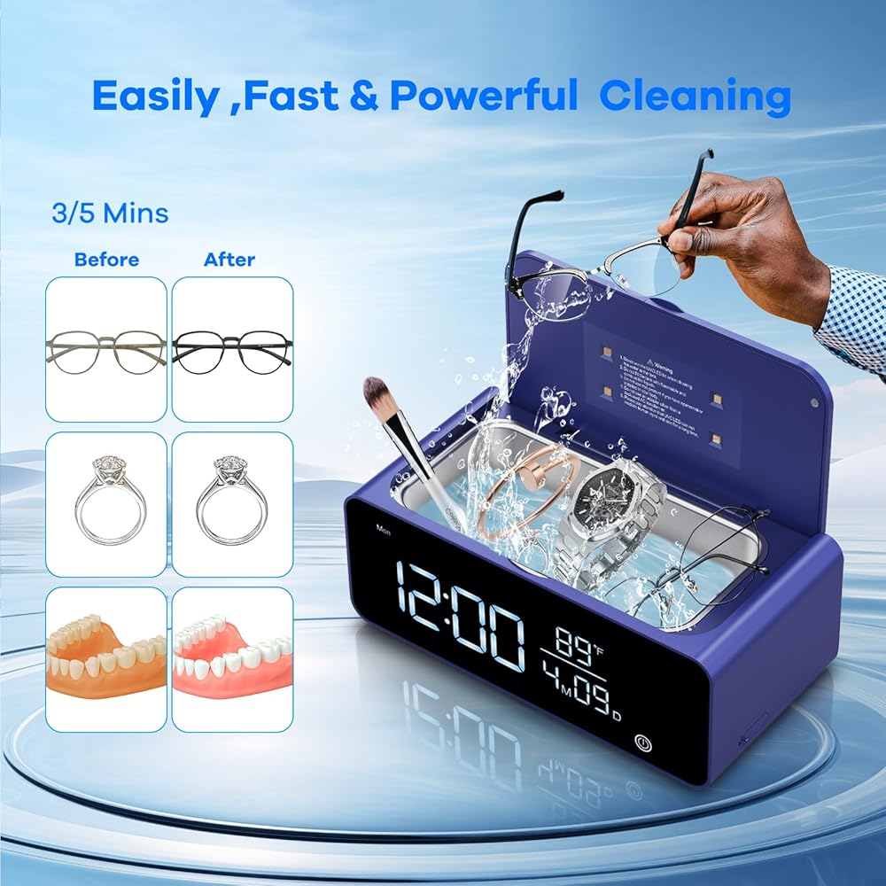 ساعة منبه رقمية مدمجة ومصباح ليلي - آلة تنظيف المجوهرات بالموجات فوق الصوتية هذه مجهزة بشاشة رقمية LED مقاس 6.6 بوصة حيث يمكنك مشاهدة الساعة وضبط ألوان إضاءة الشاشة. عند عدم استخدامه للتنظيف، فإنه يعمل كمصباح ليلي وساعة منبه ومقياس حرارة. توفر شاشة LED سهلة القراءة 7 أوضاع ألوان مختلفة، و3 مستويات سطوع مختلفة تعمل كإضاءة ليلية أيضًا.