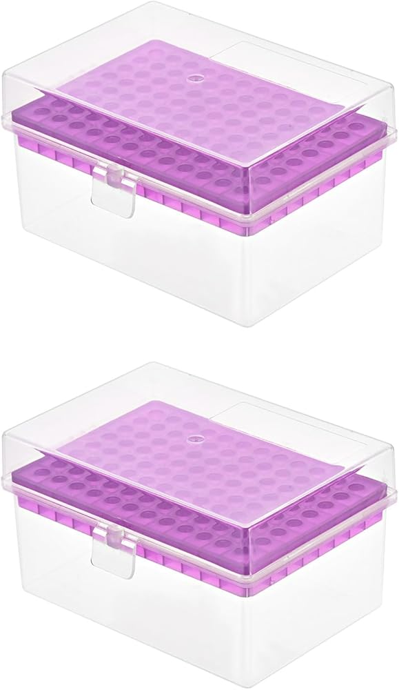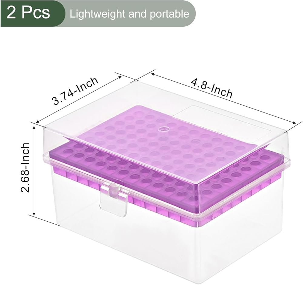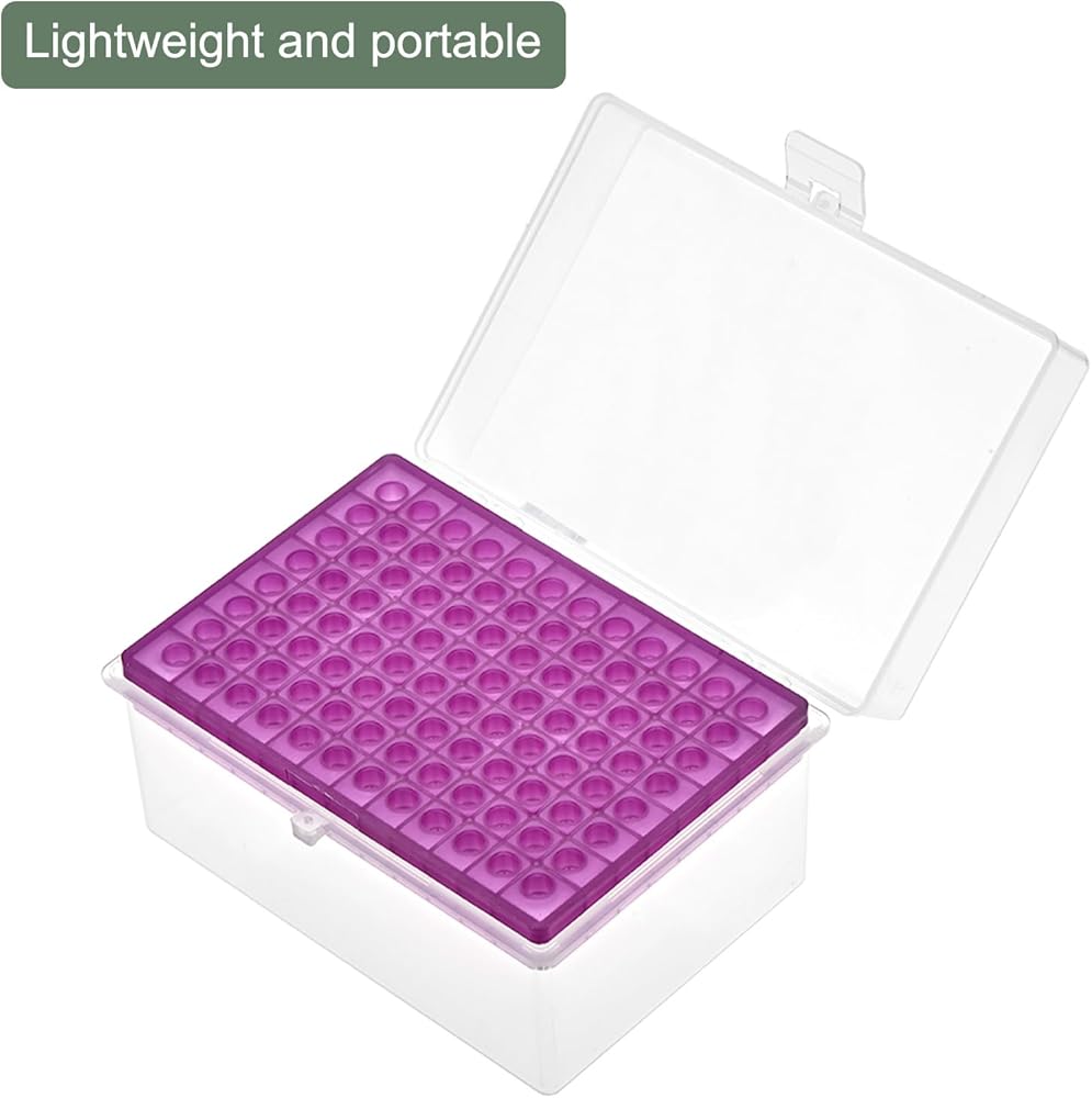 WHAT YOU GET - The package comes with 1pcs pipette tips box. Colour: Purple; Dimension: 122x95x68mm / 4.8 x 3.74 x 2.68-Inch (L*W*H); Fitting for: 300µl Pipette Tips, 96 Well; Hole Diameter: 6mm / 0.24-Inch; Temperature Resistance Range: -150C ~120C.