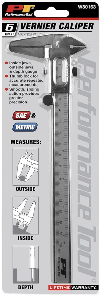 The Performance Tool steel construction caliper is the ultimate tool for precise measurements, up to 6 inches (150mm). Its quality steel construction ensures accurate inside, outside, and depth measurements, while the knurled thumb lock and sliding wheel make it easy to take and record measurements for later use. The smooth sliding action provides greater precision and control, ensuring that you get the most accurate measurements possible. The large open view window provides a clear sight of measurements, making it easy to read and record them. With a dual scale that provides standard measurements up to 1/16th of an inch and metric scale up to 1mm, this caliper is suitable for any project, big or small. Whether you're a professional or a DIY enthusiast, the Performance Tool steel construction caliper is a must-have tool for precise and accurate measurements.