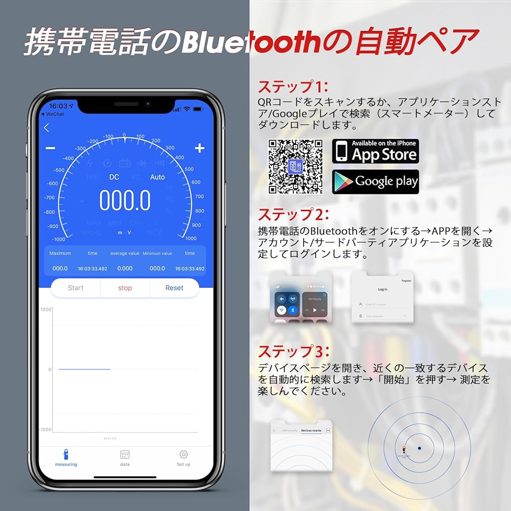 Featured with a relative value of 4000 counts auto-ranging function, this Bluetooth multimeter can be remotely monitored by the phone in 15m. Easily test AC/DC voltage/amp, capacitance, temperature(℃/℉), diode, continuity, and resistance.