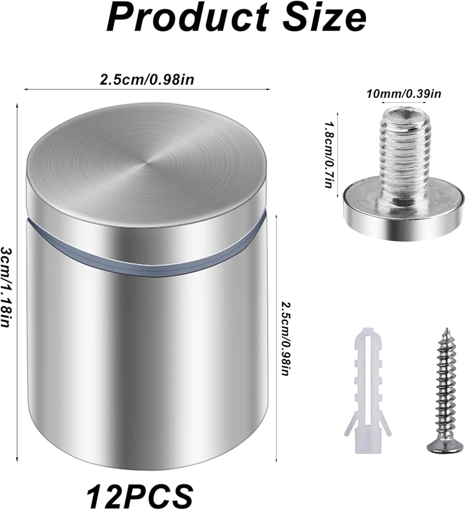 • Package Includes: You will receive 12 pcs standoff screws for acrylic sign, 12 pcs screws, and 12 pcs wall anchors, the outer diameter is 1 inch, base length is 1 in, an ideal way to display your delicate items.