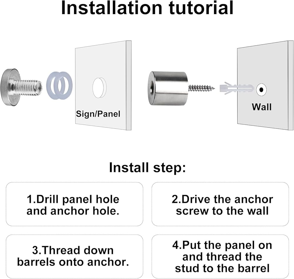 • Easy to Install: Equipped with mounting screws and wall anchors, just install the plastic expansion tube on the wall and fix the sign standoff with screws. The installation process is very convenient, it is not easy to fall off after installation, and the fixing effect is good.