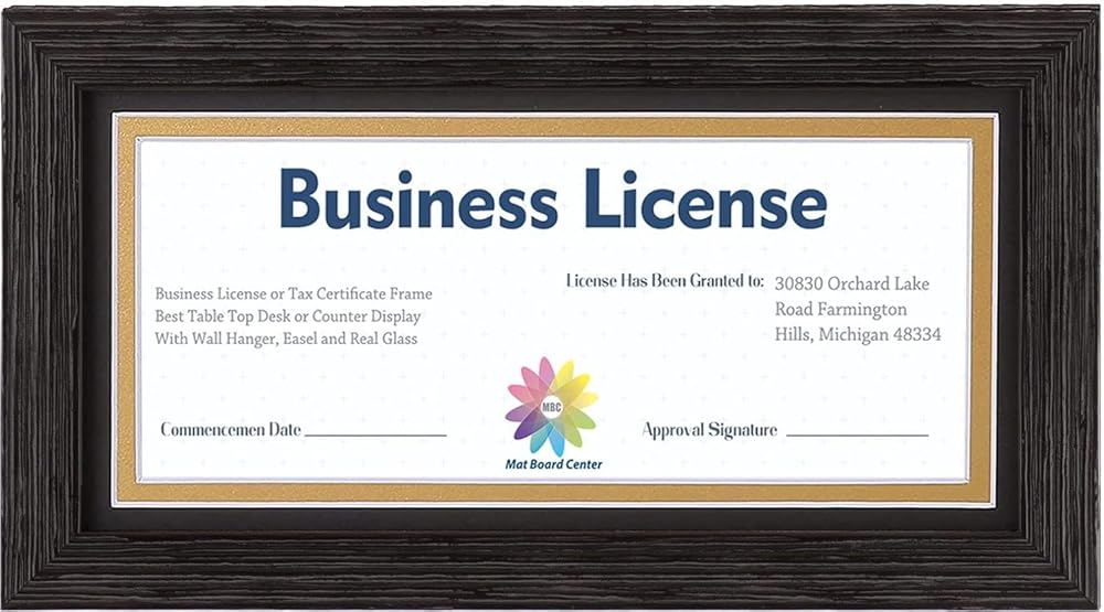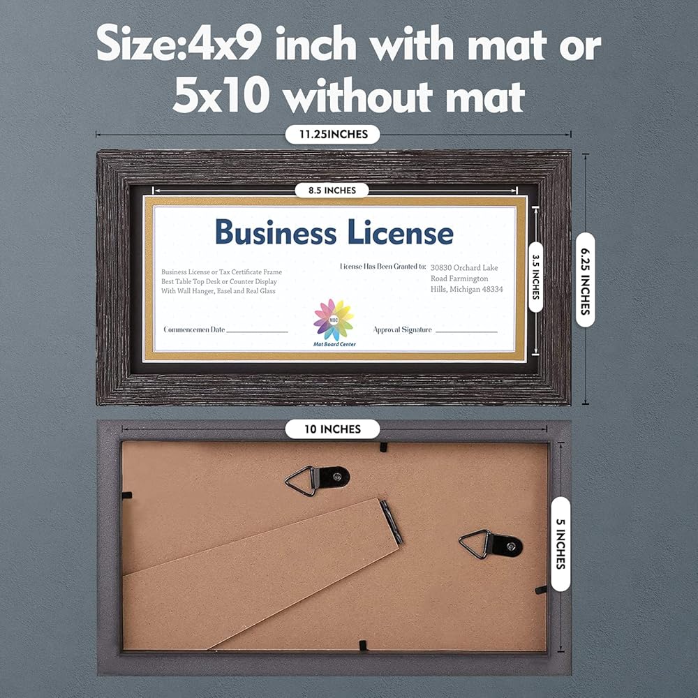 MBC MAT BOARD CENTER، إطار رخصة عمل احترافي بني داكن، حامل معلق وحامل، زجاج مقسى (إطار 5 × 10 لصورة 4 × 9 مع حصيرة مزدوجة سوداء فوق ذهبية)