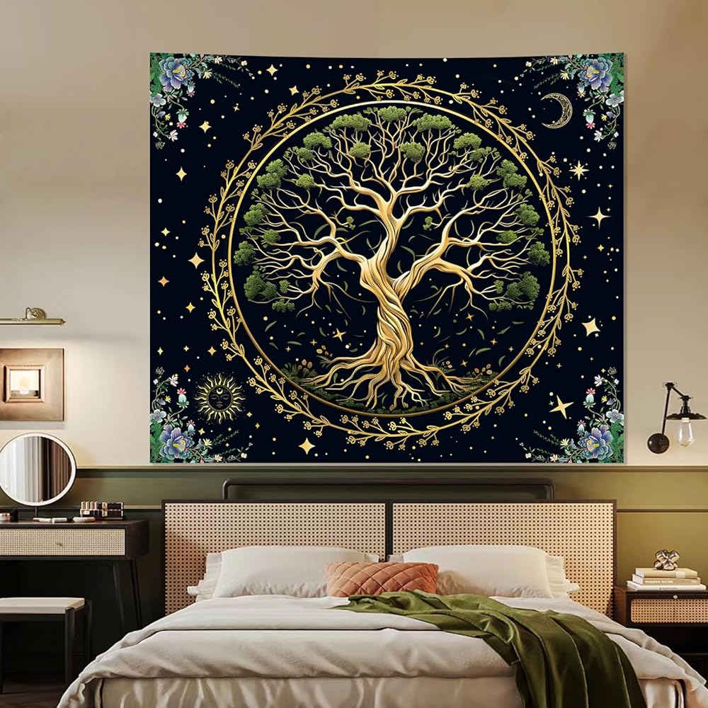 Honcet شجرة الحياة جدار الفن نسيج لغرفة النوم الجمالية، شجرة خضراء الطبيعة بوهو الأزهار المفروشات، الشمس والقمر نسيج الجدار لغرفة المعيشة مكتب النوم 51 "× 60"