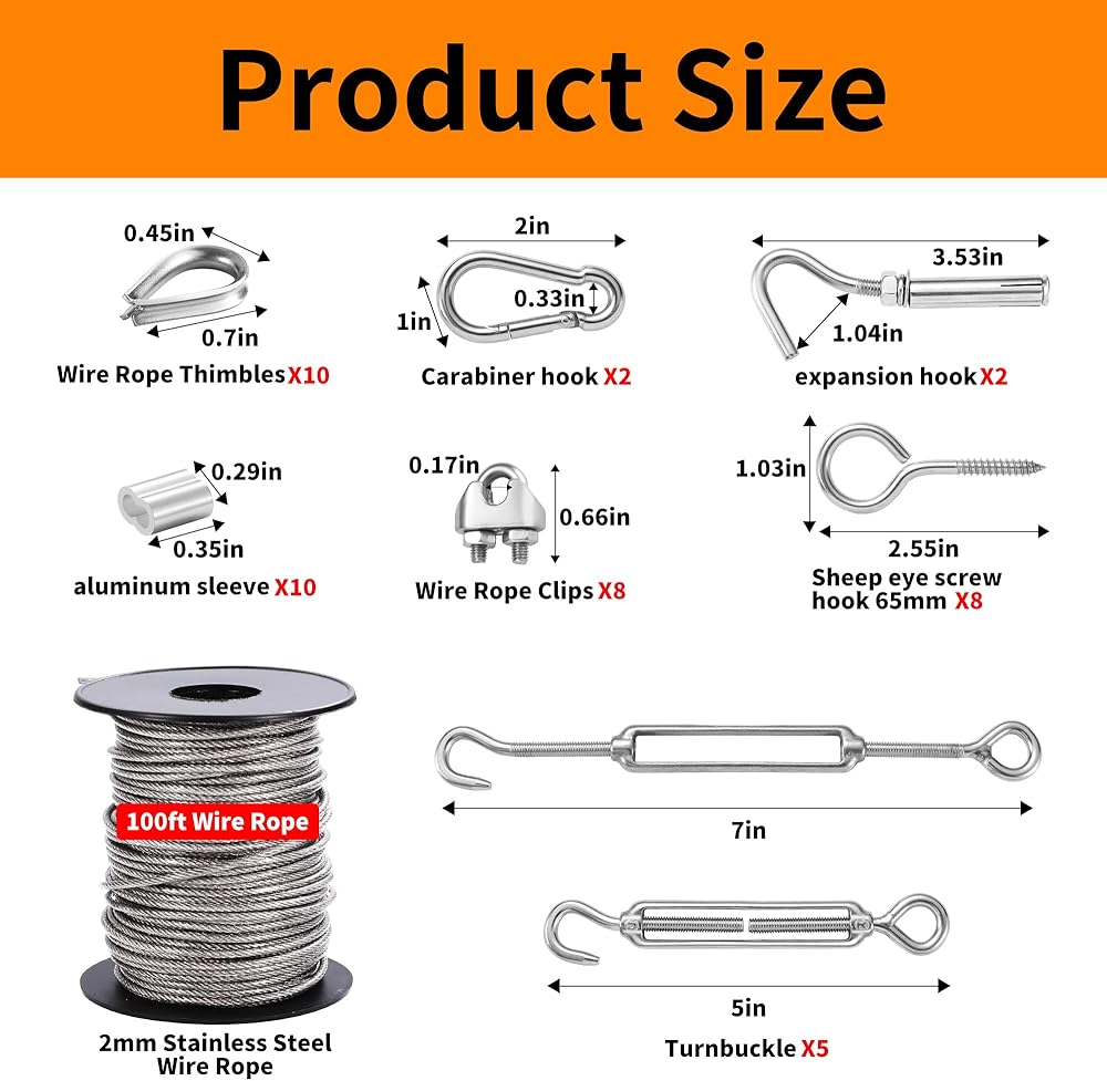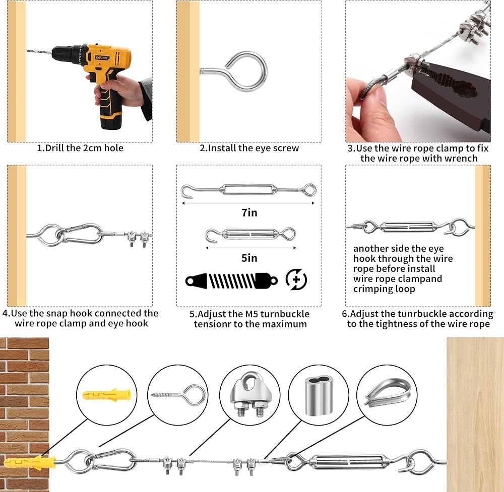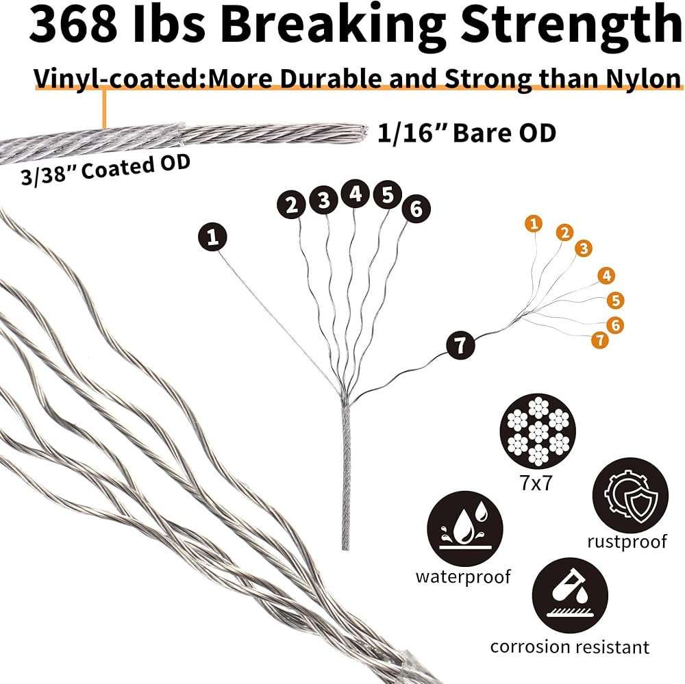 🧵【استخدام واسع】مجموعة الحبال السلكية مناسبة لمجموعة متنوعة من التطبيقات الخارجية والداخلية مثل حبال الخيمة، وخطوط الغسيل، وتعليق الضوء الخيطي، وأسلاك كابلات الستائر، ودرابزين كابلات سطح السفينة، وما إلى ذلك. ويمكنها أيضًا دعم نباتات التسلق، وأسوار الحديقة، المظلات والبرجولات ودرابزين كابلات الدرج والمزيد.