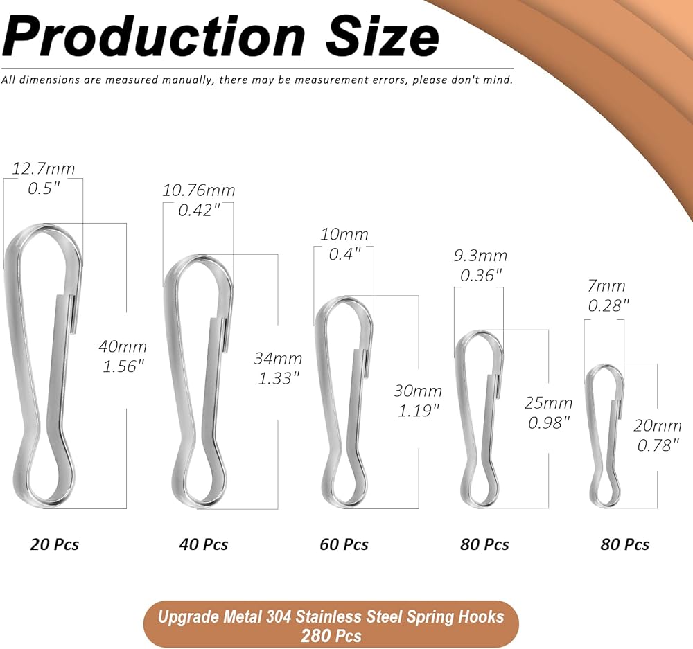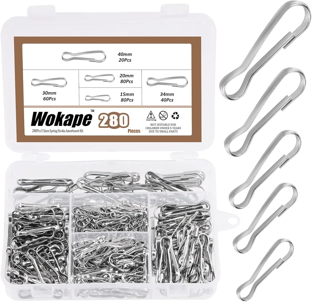 🌱 Wokape 280Pcs 5 Sizes 3/4"" 1"" 6/5"" 7/5"" 8/5"" Upgrade Metal 304 Stainless Steel Spring Hooks Assortment Kit, Lanyard Snap Clip Hooks Rust-Proof Metal Hook Perfect for Lanyard Purse, ID Card, KeyChain