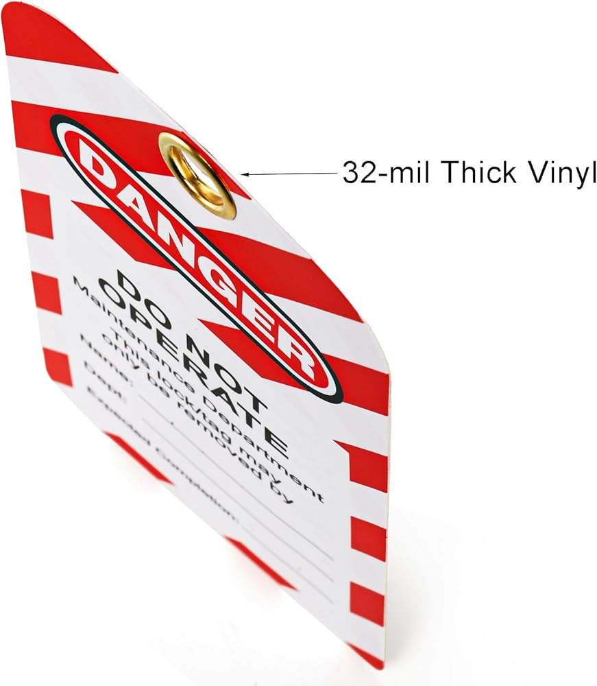 Lockout tags are made of PVC vinyl that are resistant to tearing, waterproof, and will not crack, distort, or shrink, suitable for both indoor and outdoor applications, capable of withstanding harsh weather conditions.