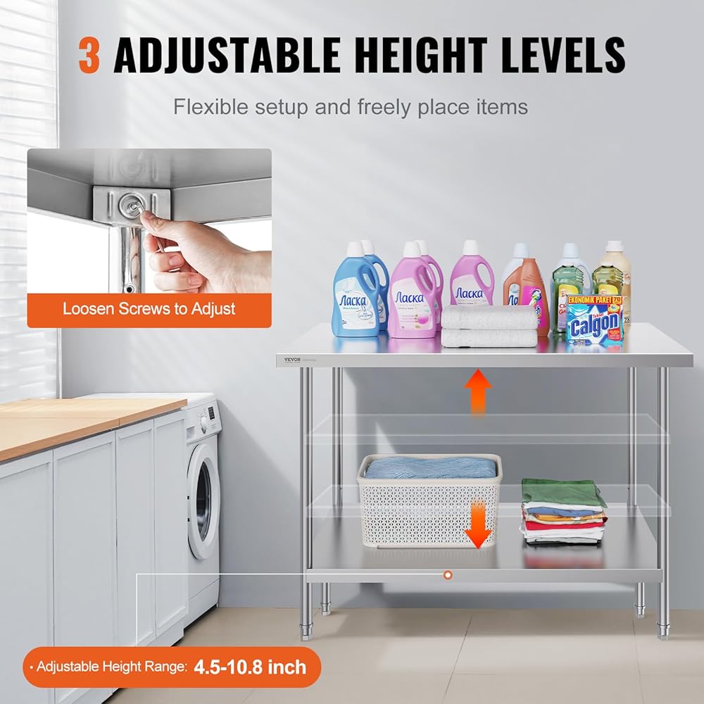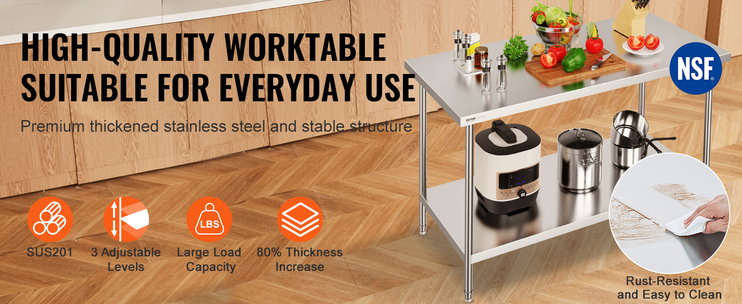 الفولاذ المقاوم للصدأ عالي الجودة: طاولة العمل هذه، بقياس 30 × 60 × 34 بوصة، مصنوعة من الفولاذ المقاوم للصدأ SUS201 لسطح الطاولة والأرفف والأرجل. إنه يوفر مقاومة فائقة للصدأ، ومظهرًا أنيقًا، وسطحًا أملسًا يسهل تنظيفه بمسحة بسيطة. معتمد من NSF، وهو يلبي معايير الصحة العامة الصارمة، مما يضمن حماية طويلة الأمد لصحتك.
