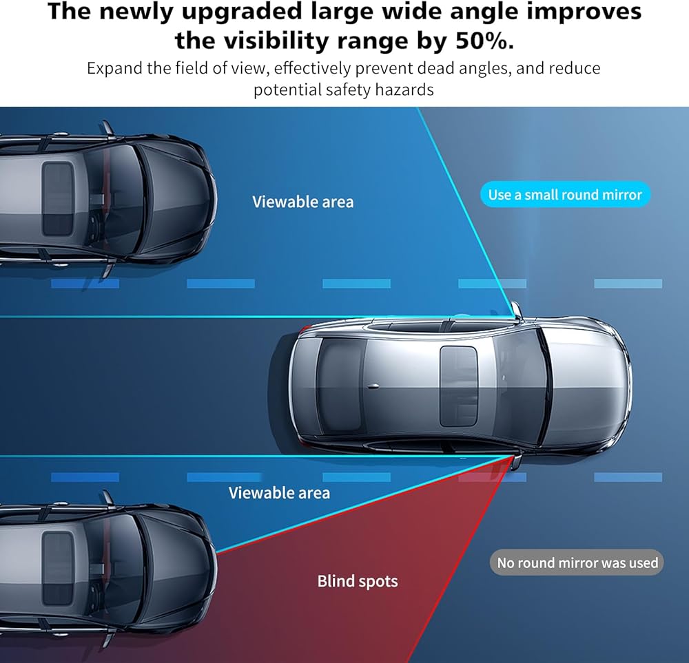 • Wide-angle Field of View: This reversing blind spot mirror upgrades the wide-angle design, increasing the visual range by 50%, it can cover more areas, help you detect potential blind spots or hidden obstacles, and reduce the risk of accidents.