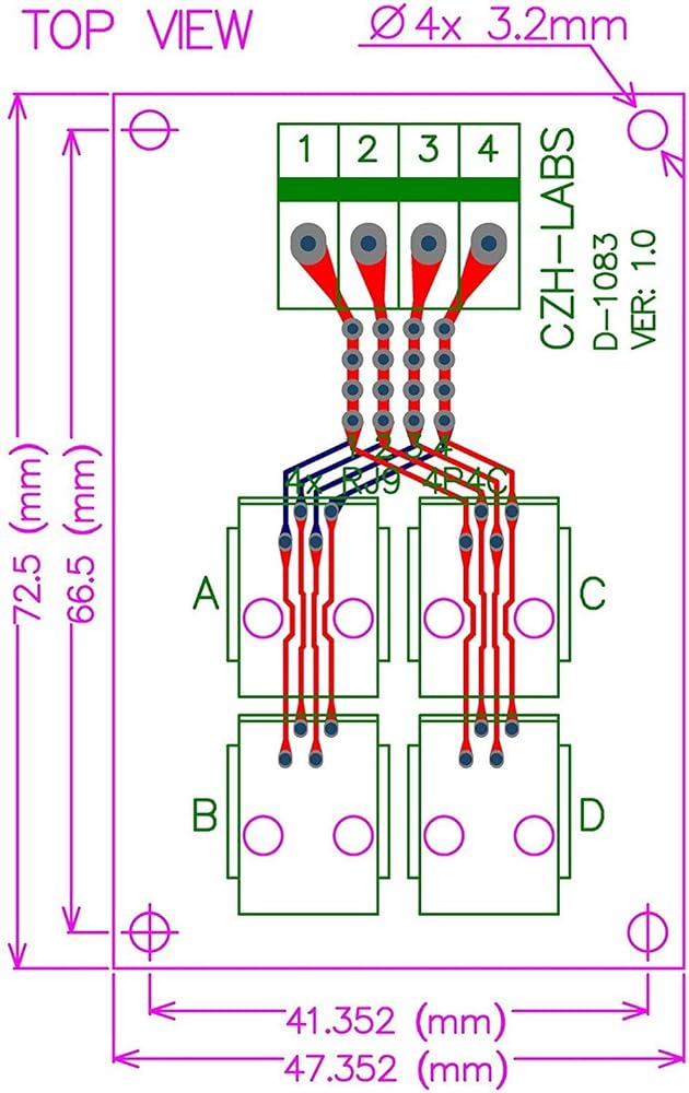 • RJ9 4-Way Buss Breakout Board. RJ9 vertical 4P4C jacks.