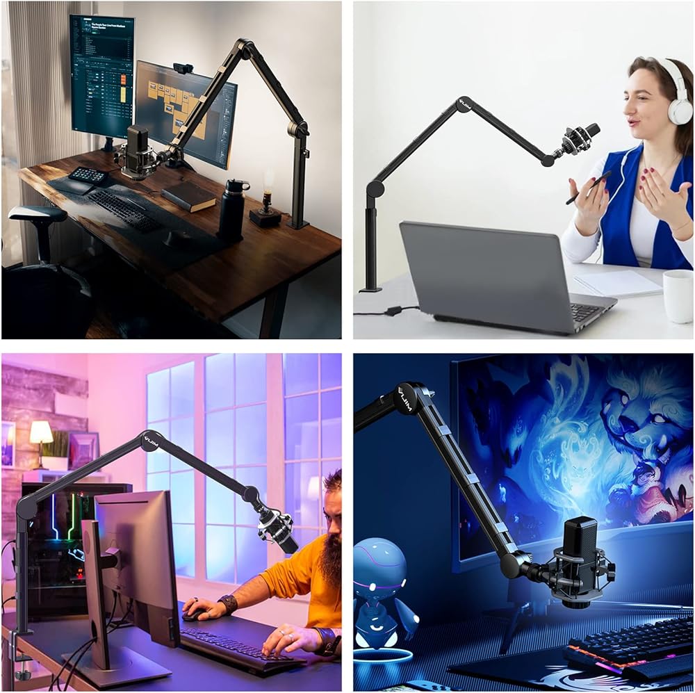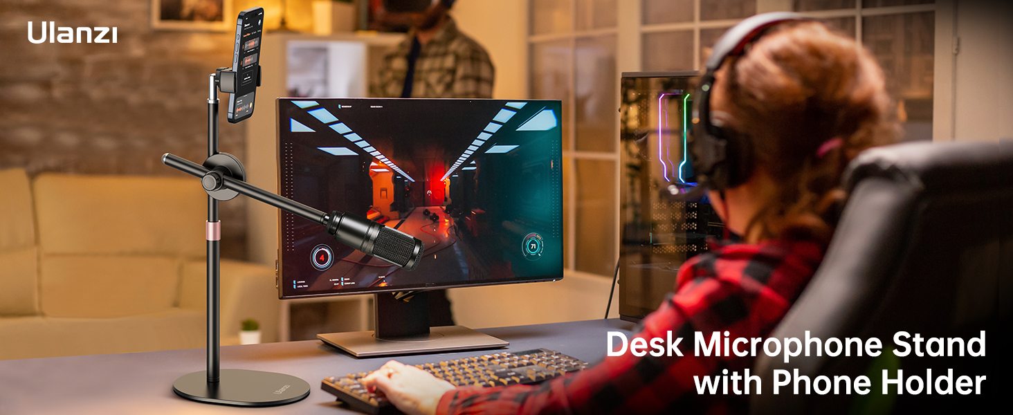 • مكتب حامل الميكروفون المُطوّر مع حامل الهاتف له أغراض متعددة مثالية للتسجيل المنزلي، والبث المباشر، والبث المباشر، والاستوديو، وطبول الجهير، ومضخمات الجيتار، وتصوير الفيديو