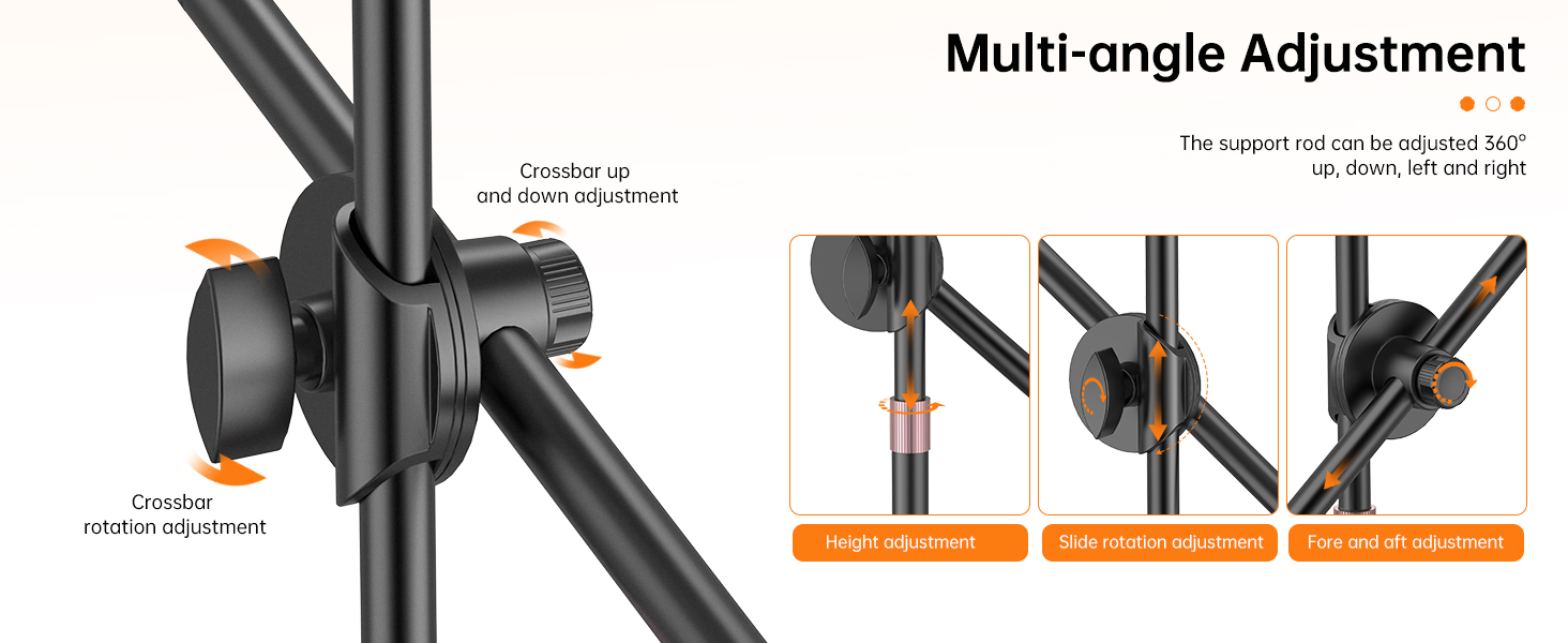• ذراع ذراع الرافعة القابل للتمديد: يتيح لك ذراع ذراع الرافعة المتداخل تعديل الطول والزاوية إلى الزاوية المثالية بشكل مستقل. عندما يتم تمديد ذراع الرافعة إلى منتصف الطريق، يكون الحمل الأقصى 4.4 رطل/2.0 كجم