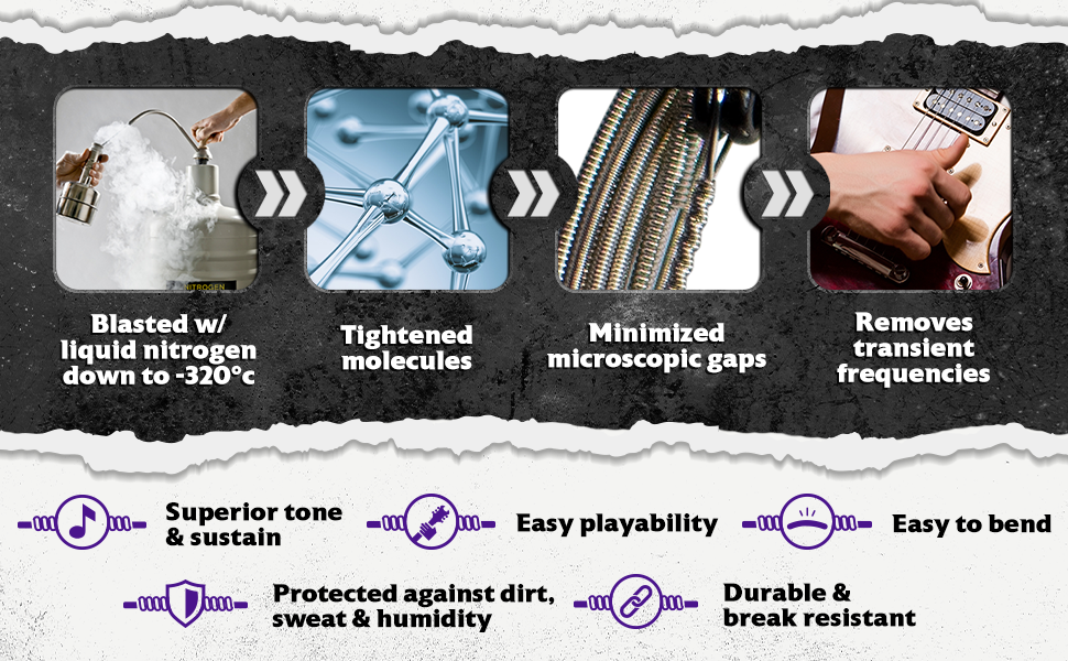 أوتار الجيتار التي تظل متناغمة لفترة أطول. تحتوي أوتار الجيتار المصنوعة من النيكل على سلك ملفوف من النيكل بنسبة 8% ملفوف حول سلك فولاذي على شكل سداسي، ومعالج بالتبريد باستخدام نيتروجين سائل بدرجة -320 درجة، مما ينتج توترًا والتفافًا متساويًا يبقى في تناغم.