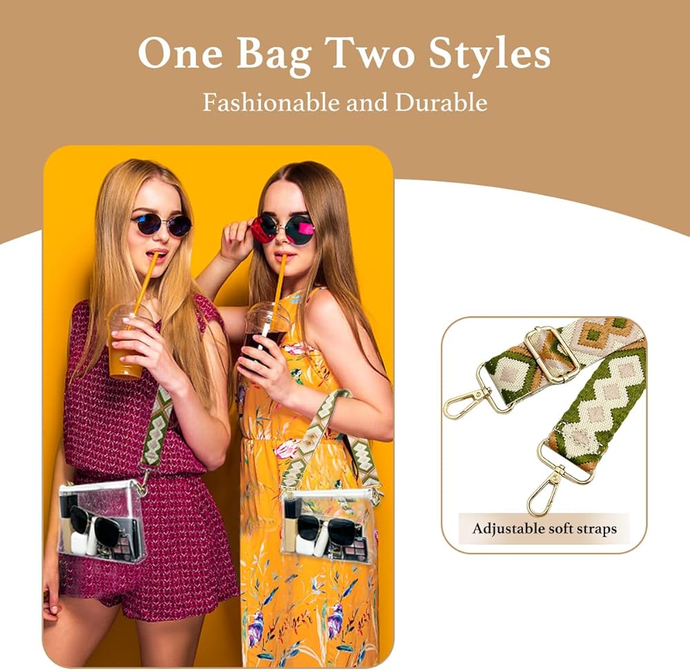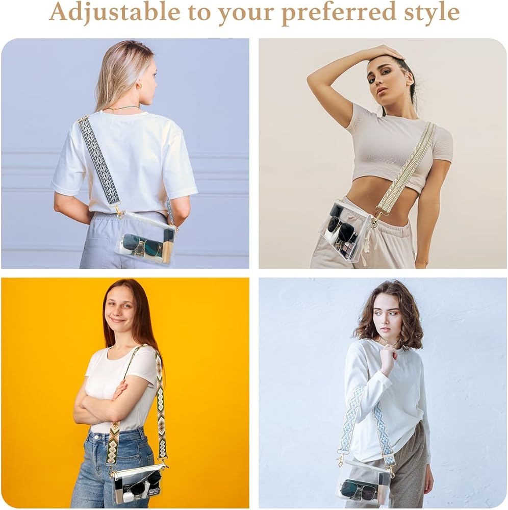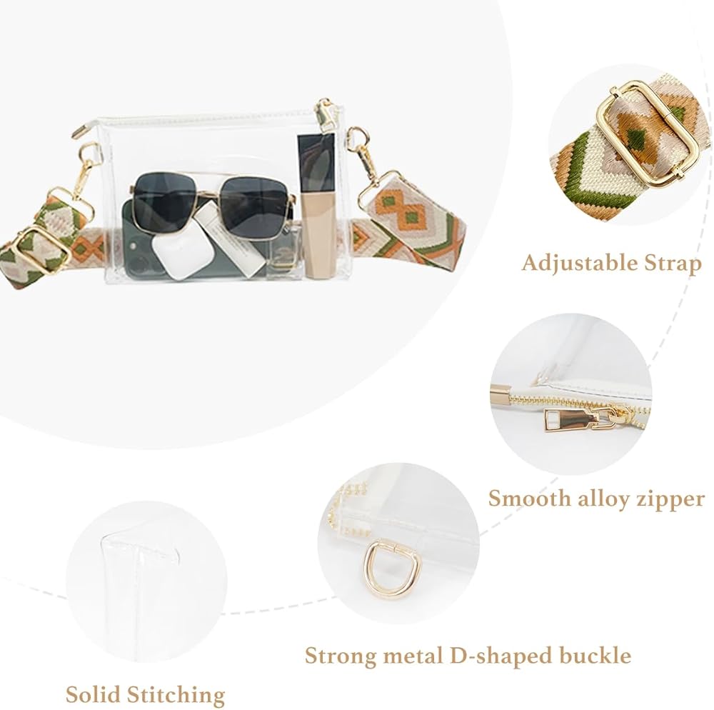 مناسبة للعديد من الاقتران: تتميز هذه الحقيبة الشفافة بحزام كتف منسوج أنيق ومزينة بسحابات ذهبية اللون ومشابك معدنية، مما يوفر مزيجًا أنيقًا ومصقولًا من الألوان. حجمها الصغير مثالي لحمل أغراضك الأساسية دون أن تكون كبيرة الحجم. سواء كنت تريد مظهرًا يوميًا كاجوال، أو تحضر حدثًا رياضيًا، أو تستمتع بمهرجان موسيقي، فهذه المحفظة هي الإكسسوار المثالي.