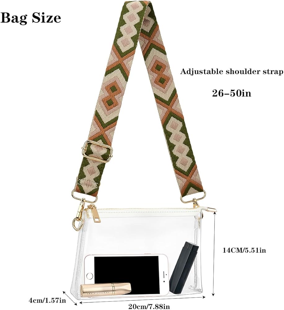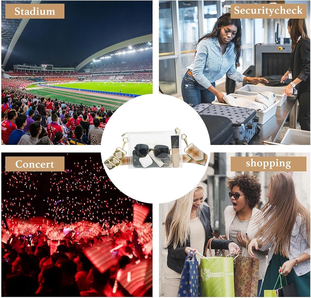 حقيبة كروس شفافة معتمدة من الاستاد: بأبعاد الطول: 7.88 بوصة، الارتفاع: 5.51 بوصة، العرض: 1.57 بوصة، تلبي هذه المحفظة الشفافة الحد المسموح به للحقيبة الشفافة لأحداث الاستاد 12 × 6 × 12. لا يتوافق السحاب الذهبي والتصميم الشفاف مع لوائح الاستاد فحسب، بل يعرض أيضًا أسلوبك الشخصي من خلال مظهره العصري.