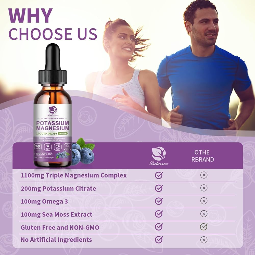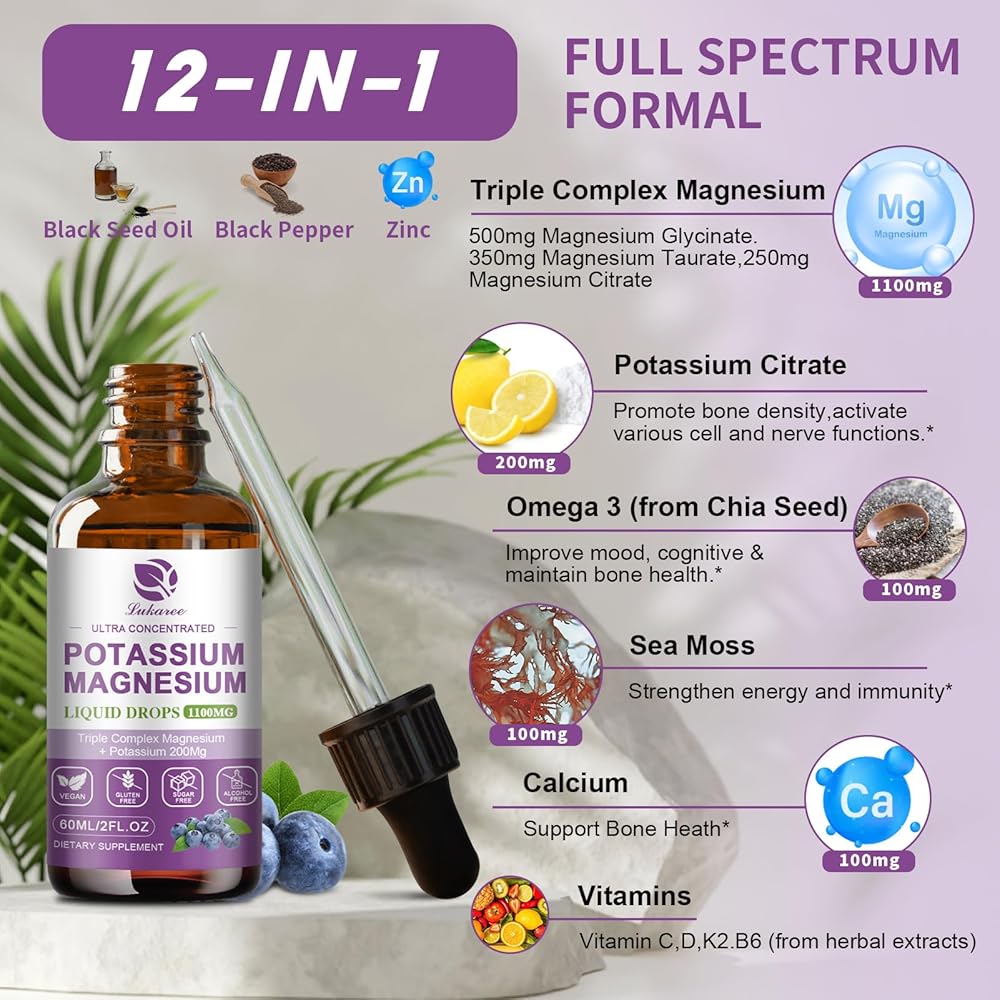 امتصاص قوي ومتقدم: سائل البوتاسيوم والمغنيسيوم الخاص بنا مصنوع من تركيبة احترافية ومغذيات غذائية كاملة، وهي أكثر كفاءة ونقاء من الكبسولات والأقراص. بالإضافة إلى تكنولوجيا الاستخراج والتعبئة المتقدمة الفريدة من نوعها من Lukaree، فإنه يضمن جودته الأصلية ونقائه. قطرات مغنيسيوم البوتاسيوم الشاملة 12 في 1 عالية الامتصاص، مما يوفر لك طريقة مريحة وفعالة لتكملة التغذية، مما يجعل الصحة على رأس أولوياتك! *