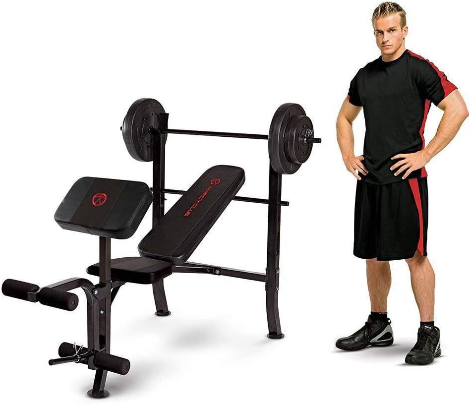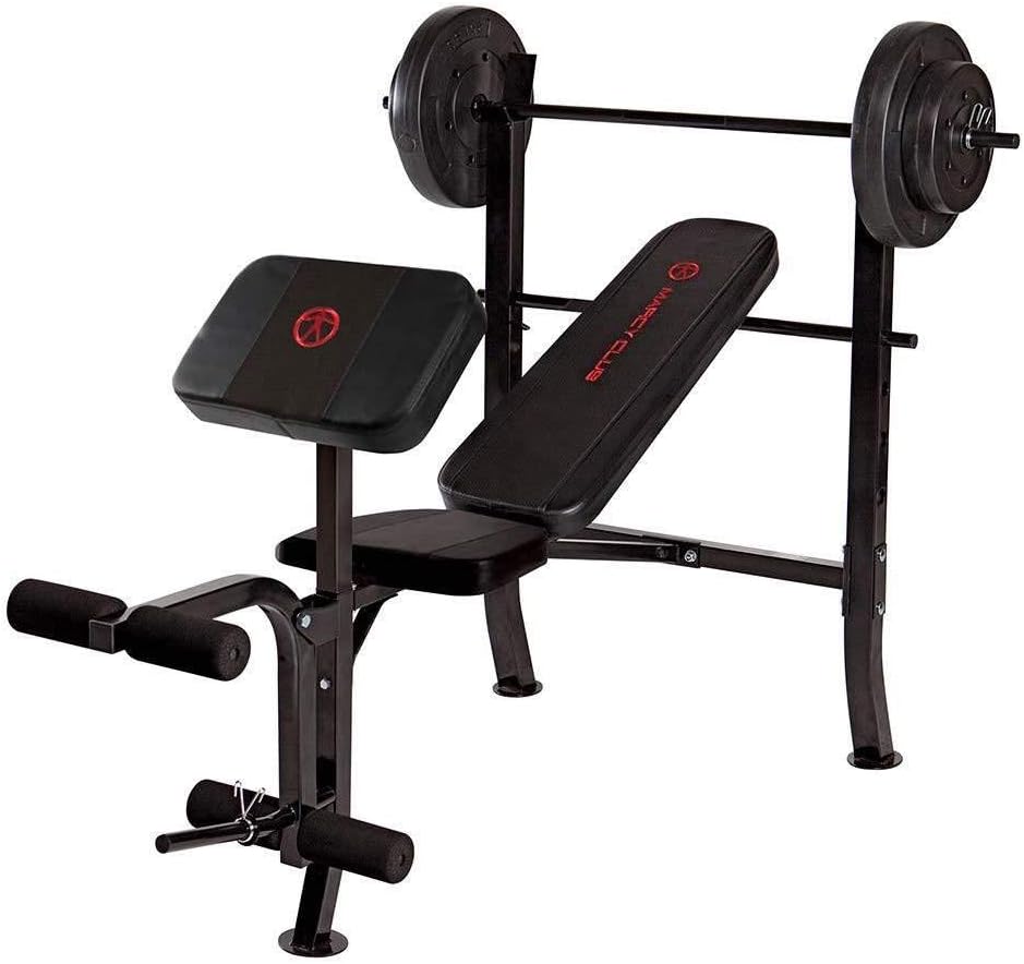 With the Marcy Club MKB-2081 Standard Weight Bench w/ 80lb Weight Set, achieving an invigorating full body workout in the comfort of your own home has never been easier. Work your upper body to the max with the five-position back pad, which allows for multiple chest press exercises so you can work major muscle groups from all angles. This all-in-one exercise bench also comes equipped with a total leg developer with comfortable foam roller pads so you can tone and strengthen your lower body with ease. Steel bar catches accepts the included standard size bar, which also comes with two 25lb and two 15lb weight plates. Deluxe rolled upholstery constructed from top-grade high density foam makes for an optimal strength training session while a heavy duty steel tube frame with a durable powder coated finish ensures years of use.