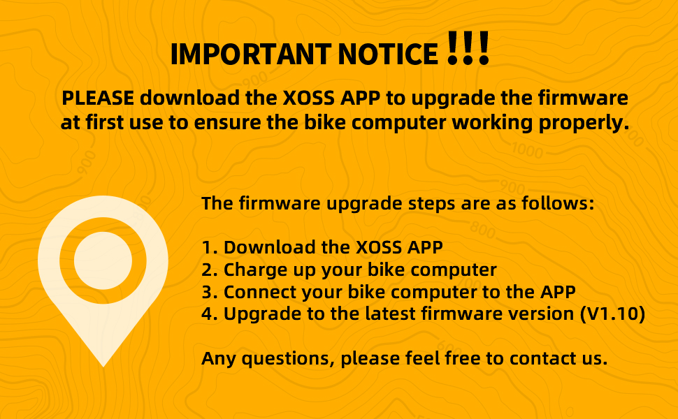 ملاحظة مهمة: يرجى تنزيل تطبيق XOSS لترقية البرنامج الثابت عند الاستخدام الأول لضمان عمل كمبيوتر الدراجة بشكل صحيح. خطوات ترقية البرنامج الثابت هي كما يلي:1. قم بتنزيل تطبيق XOSS2. اشحن كمبيوتر الدراجة الخاص بك3. قم بتوصيل كمبيوتر الدراجة الخاص بك إلى APP4. الترقية إلى أحدث إصدار من البرنامج الثابت (V1.10). أي أسئلة، لا تتردد في الاتصال بنا.