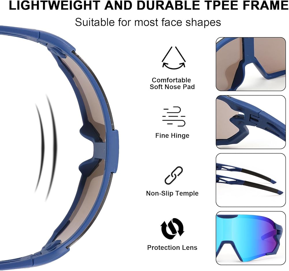 راحة رياضية: تضمن الإطارات خفيفة الوزن والمتينة الراحة القصوى أثناء ممارسة الأنشطة الخارجية. يوفر تصميم الإطار الكبير المكون من قطعة واحدة مجالًا واسعًا للرؤية، إلى جانب حماية استثنائية من الرياح والغبار، مما يجعلك تركز على أنشطتك.