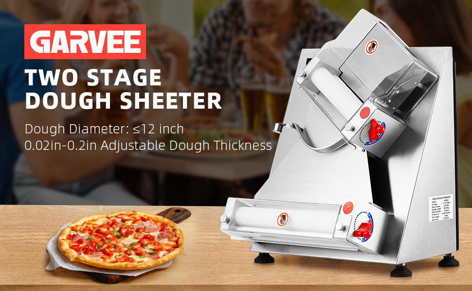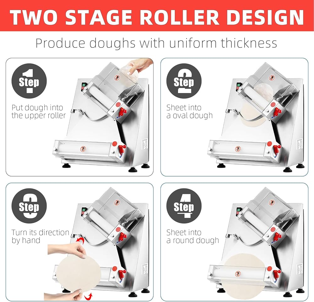 تعديل سُمك وحجم البيتزا: إن ماكينة لف عجين البيتزا التجارية الخاصة بنا مجهزة بمقبضين للتحكم في السُمك. من خلال ضبط المقابض، يمكنك إنشاء عجين بسمك 0.02-0.2 بوصة. في نفس الوقت، يمكن للأسطوانات العريضة أن تقوم بفرد عجينة البيتزا من 4 إلى 12 بوصة، مما يلبي جميع متطلباتك لصنع بيتزا بأحجام مختلفة.