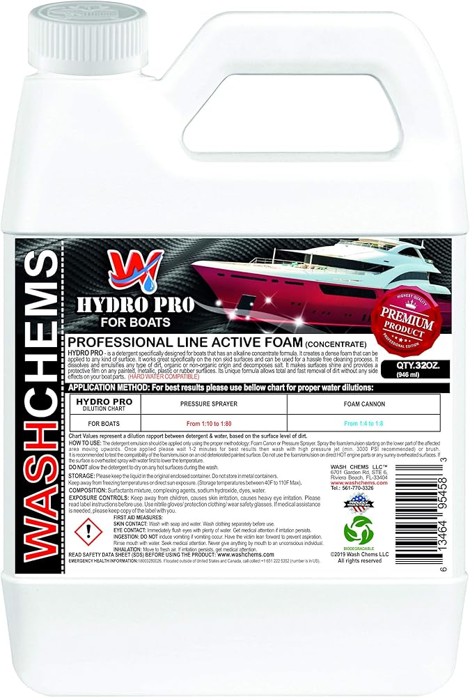 Commercial Grade Boat Wash Foam Detergent Soap with Heavy Degreaser Containing Active Alkaline Concentrate and TFR (Traffic Film Remover). Marine vessel wash is safe on boats, jet skis, and water crafts. Active Foam Non-skid boat cleaner safely removes oil stains, salt, diesel exhaust stains and more! HYDRO PRO is a detergent specifically designed for marine boats that has an alkaline concentrate formula. It creates a dense foam that can be applied to any kind of surface. Safely washes watercrafts, boats, jet skis and trailers. Also cleans your cars and trucks! Can be used also to clean carpets/tiles/walls by using a pressure washer. It works great specifically on the non skid surfaces and can be used for a hassle free cleaning process. It dissolves and emulsifies any type of dirt, organic or non-organic origin and decomposes salt. It makes surfaces shine and provides a protective film on any painted, metallic, plastic or rubber surfaces. Its unique formula allows total and fast removal of dirt without any side effects on your boat parts. Wash cars more efficiently, only one gallon of Wash Chems is equivalent to using ten gallons of a competing brand. Just apply and rinse for a touchless wash. Washing boats, jet skis and water crafts has never been this easy with the Hydro Pro Marine Vessel Detergent Soap Foam Cleaner.