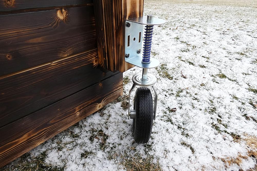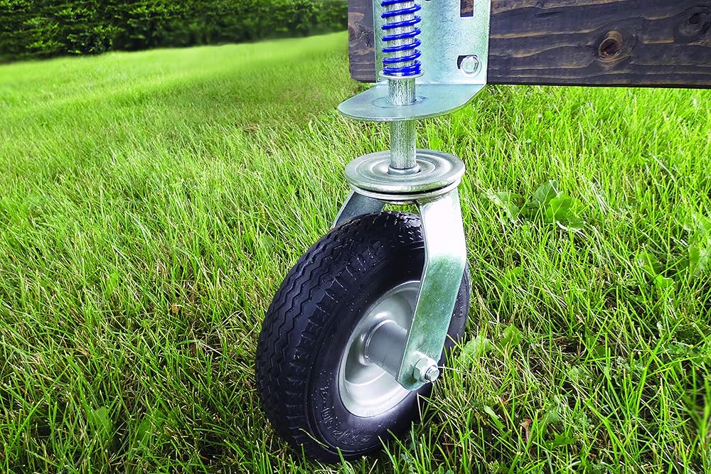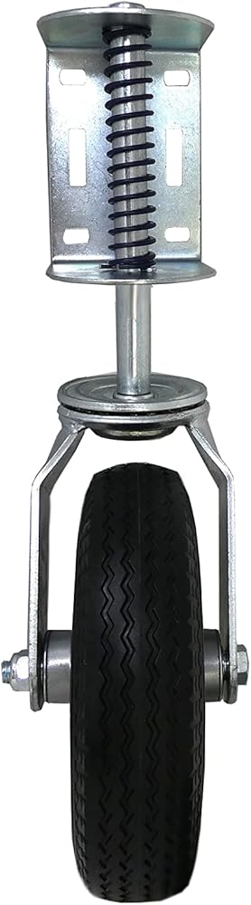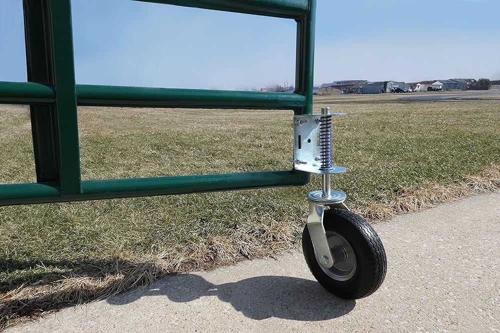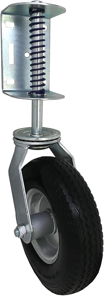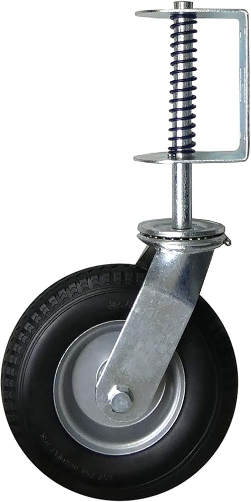 This gate caster with adjustable spring bracket is designed to allow gates to open and close freely. It features a 220 lb. load rating and a spring-loaded clamp that acts as a shock absorber when the caster is rolling over rough or uneven surfaces. It also features a universal mount for wood or metal gates.