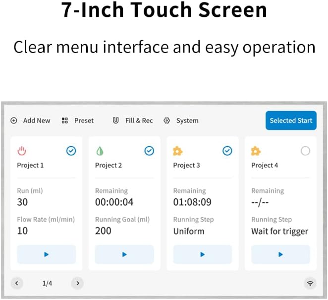 يمكن التحكم في هذه المضخة التمعجية الذكية من خلال شاشة اللمس الخاصة بها مقاس 7 بوصات، ويمكن أيضًا التحكم فيها عن بعد من خلال التطبيق؛ يمكن ضبط كل رأس من رؤوس المضخة الخاصة به ليعمل بشكل مستقل، ولكنه يدعم أيضًا التحكم المتزامن في العملية؛ كل قناة لديها وظيفة معايرة معدل التدفق مستقلة؛ يمكن ضبطها مرة أخرى على زاوية الشفط ووقت الشفط؛