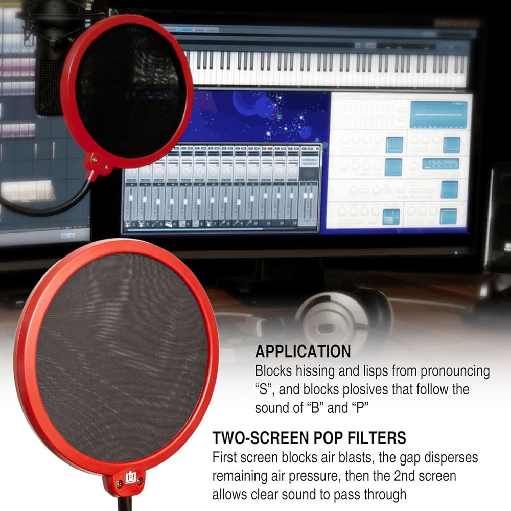 شاشة رياح للميكروفون بفلتر بوب مزدوج الطبقة من ديكو جير مع مشبك حامل ميكروفون قابل للتعديل برقبة الإوزة (أسود مع حافة حمراء)