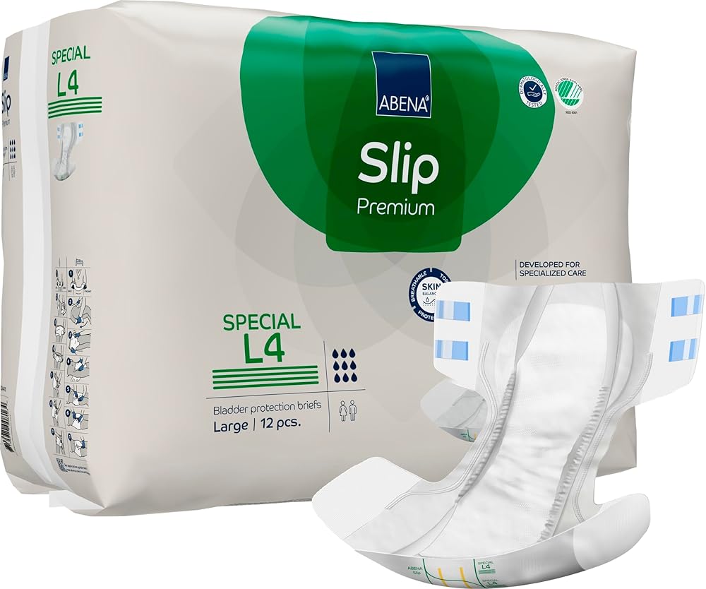 Abrena Slip Special is the return of Abena's Abri-Form classic product design for heavy incontinence. Abena Slip Special is a all-in-one diapers for heavy incontinence designed to give optimum leakage security for highly demanding situations. Our Premium full top-end quality and top-of-the-line functionality. Full breathability. Soft, comfortable and noiseless. Optimal leakage protection provided by soft and reliable leakage barriers extended right to the edge and built-in cross barriers at the rear. Unique Top Dry system providing a dry surface and rapid absorption. Excellent absorption. Flexible tape equipped with adhesive and hooks to allow for repositioning. Wetness indicator with graduation scale –for better indication of capacity use. Latex-free and non-chlorine bleached. Nordic Eco-Label. Dermatologically tested.