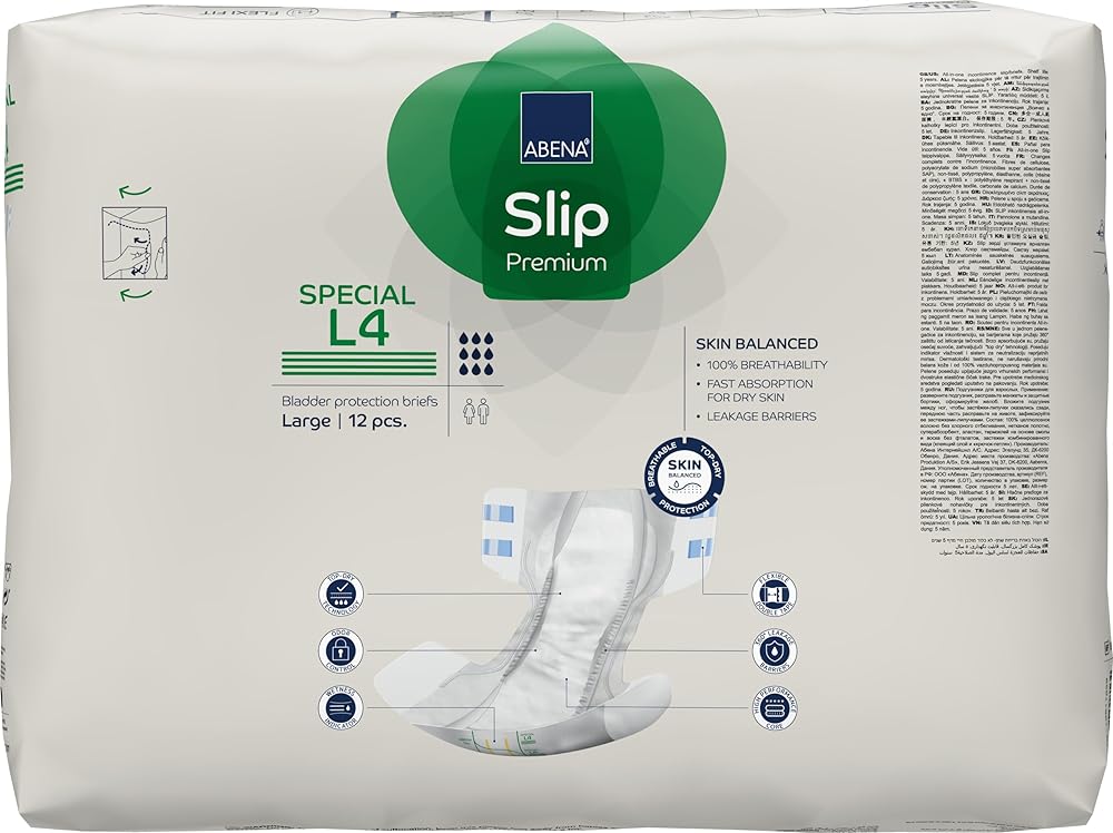 The Abena Slip Special Premium size L4 fits hips 39.5"-59"; Absorbs up to 135 fl oz