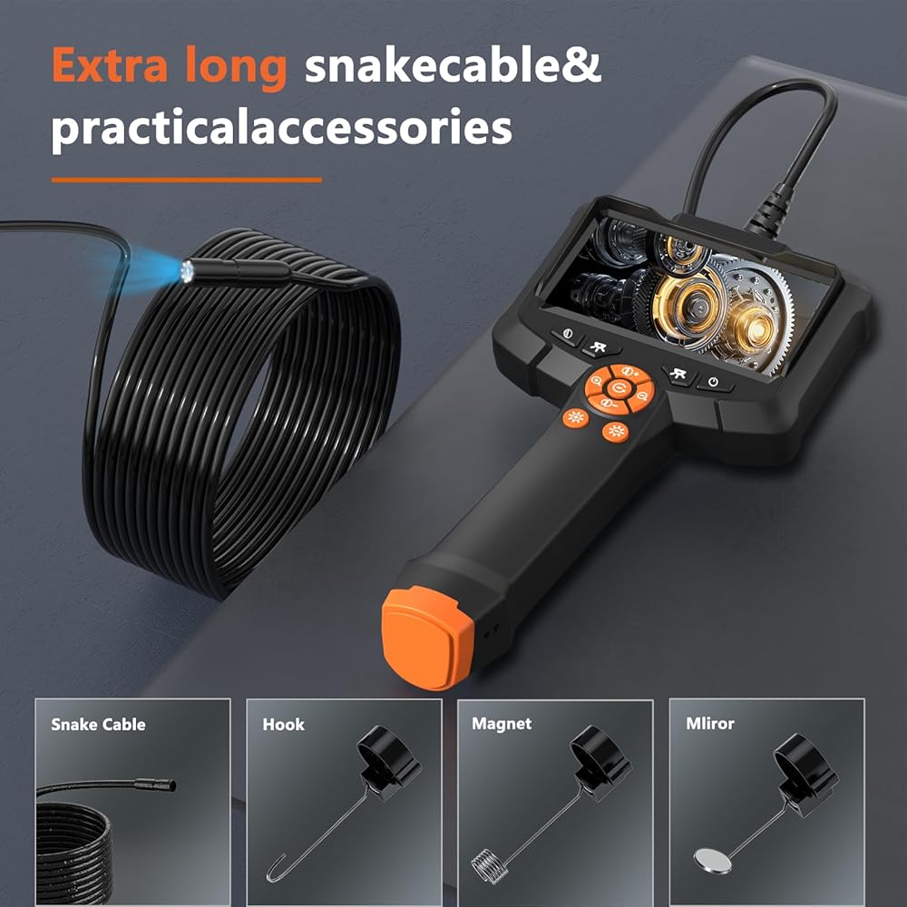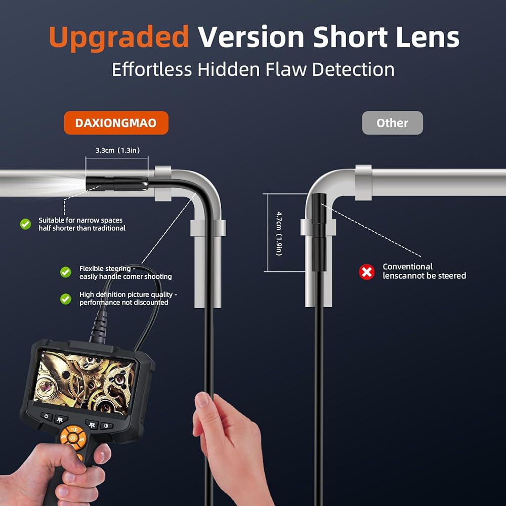 【كاميرا منظار قابلة للتعديل مع ضوء】: تستخدم كاميرا الفحص هذه دورانًا بمقدار 180 درجة لاتجاه الكاميرا من أجل مراقبة أفضل. ولها ثلاثة مستويات سطوع قابلة للتعديل، مما يضمن الحصول على صور واضحة حتى في الظروف المظلمة. يبلغ الطول البؤري للكاميرا الأمامية 3-10 سم/1-4 بوصة، والكاميرا الجانبية 2-6 سم/0.8-2.4 بوصة. يمكن ثني الكابل شبه الصلب بطول 16.5FT والحفاظ عليه في شكله للدخول إلى مختلف المناطق الضيقة وتلبية احتياجات الاستخدام المختلفة.