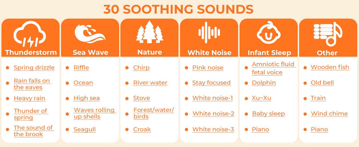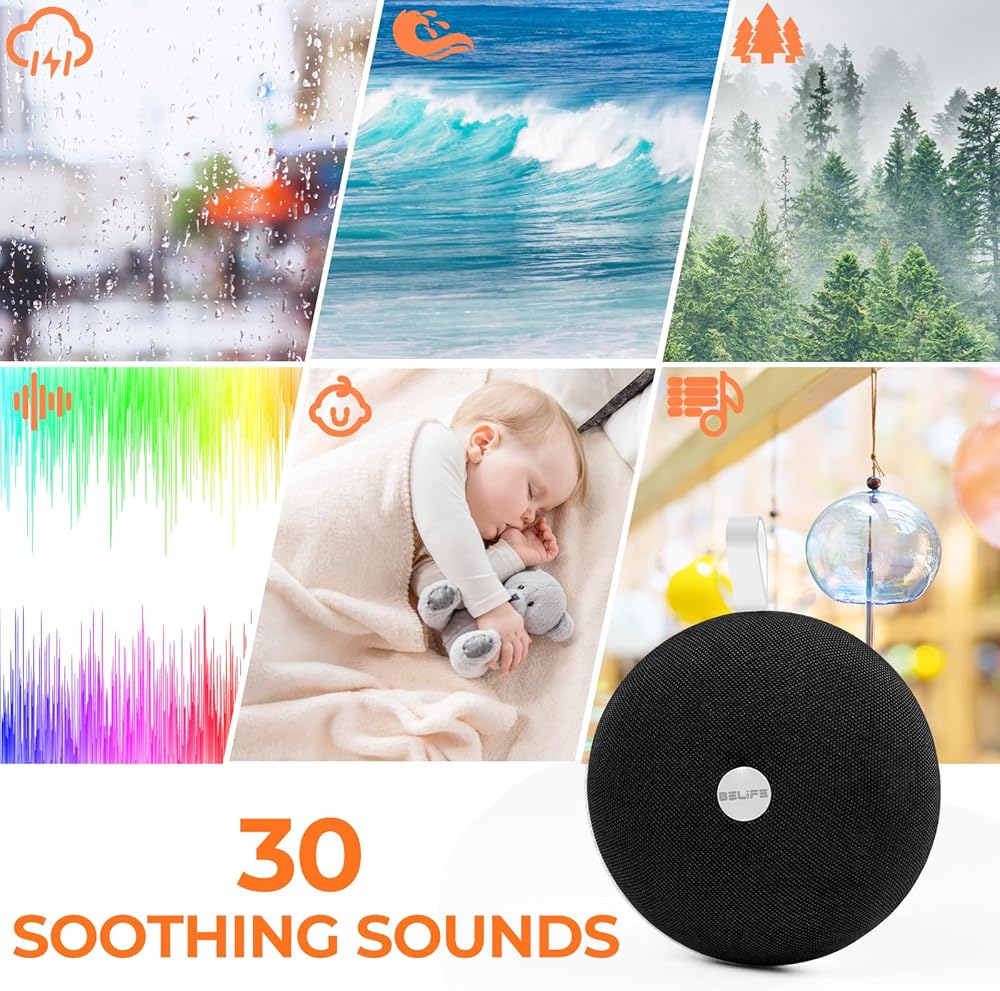 • [30 صوتًا طبيعيًا ومهدئًا] توفر آلة الضوضاء البيضاء لدينا 30 صوتًا مهدئًا، هناك ستة أنواع كبيرة من الأصوات، والعواصف الرعدية، والأمواج، والطبيعة، والضوضاء البيضاء، ونوم الطفل، وغيرها، وتحتوي كل فئة على خمسة أنواع مختلفة من الأصوات.