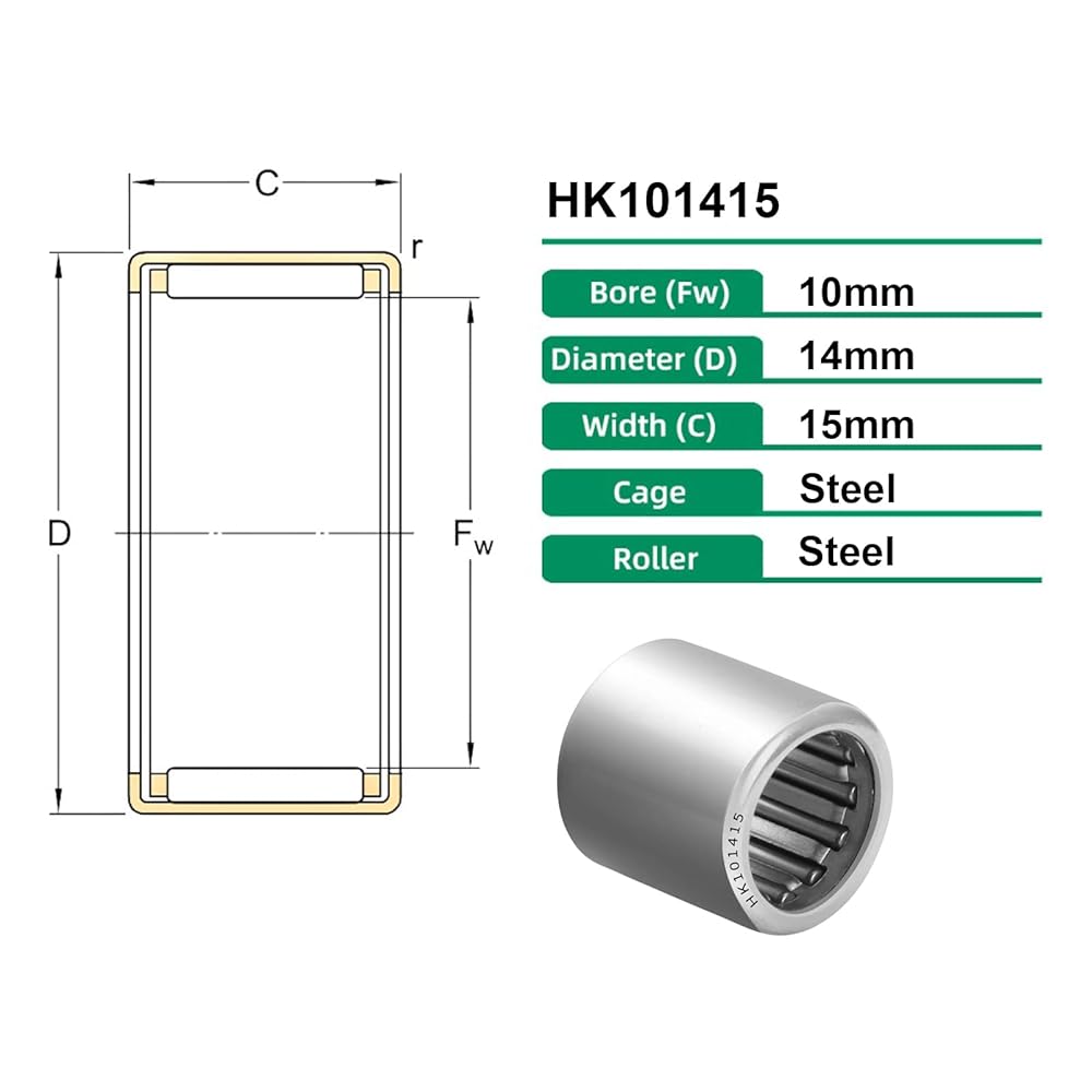 Drawn Cup Needle Roller Bearings, 10pcs HK101415 Open End Caged Bearing, 10mm Bore, 14mm OD, 15mm Width ST14 Steel Single Row Roller