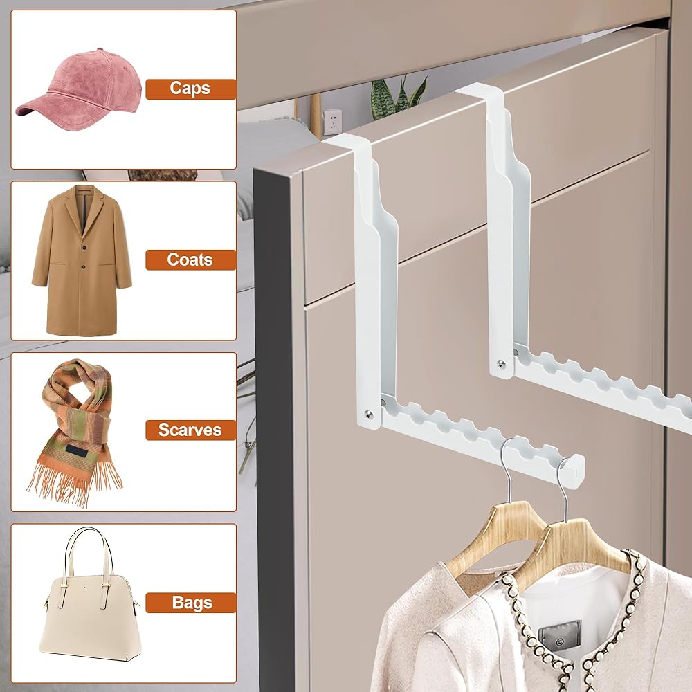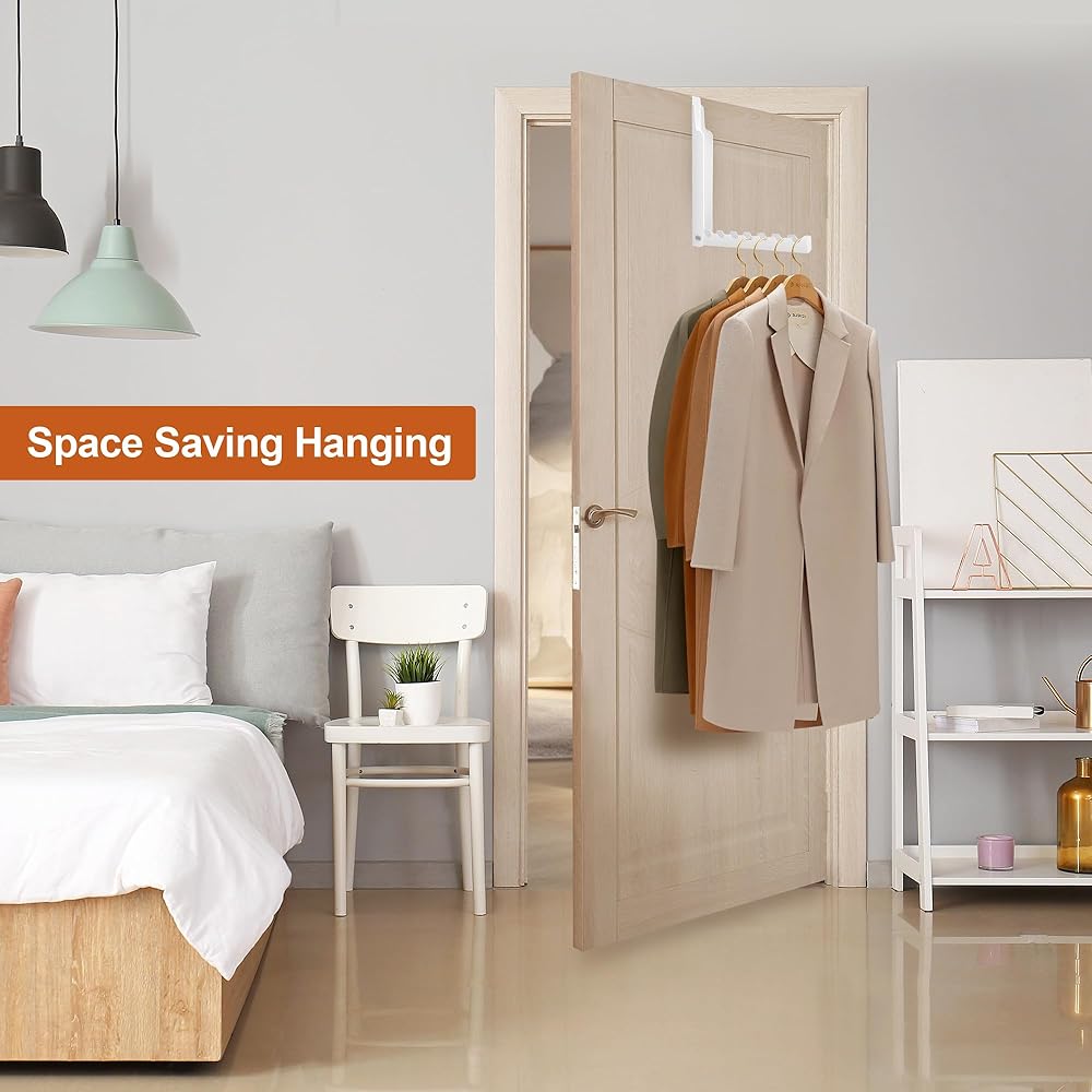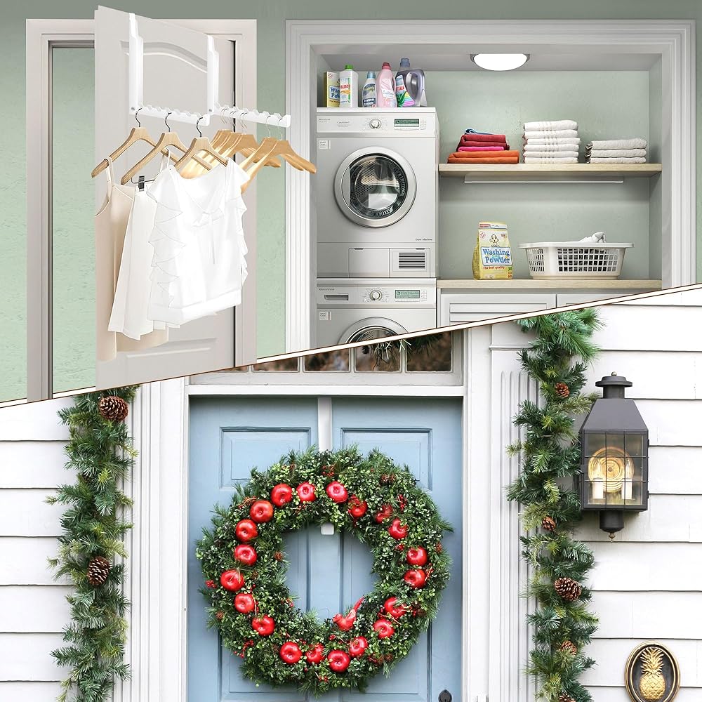 This is a multi functions heavy duty over the door hangers for clothes. In the laundry room, it is a folding laundry room hanging rack. In the bedroom, it is a over door hanger for your suits or weekly outfits. In the living room, it is a good coat rack or an over the door organization tools.