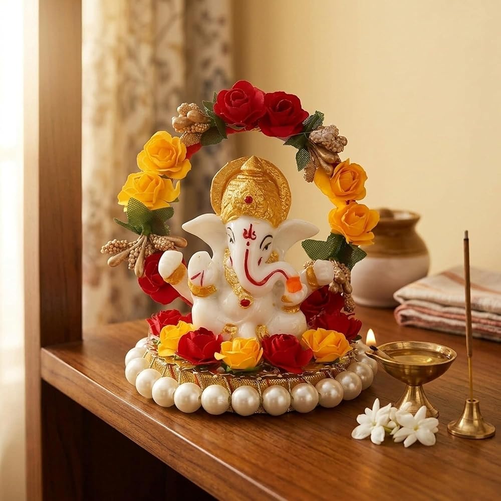 Package Content : One Polyresin Lord Ganesha Idol on Decorative Handcrafted Rose Flower Plate for Home and Car Dashboard