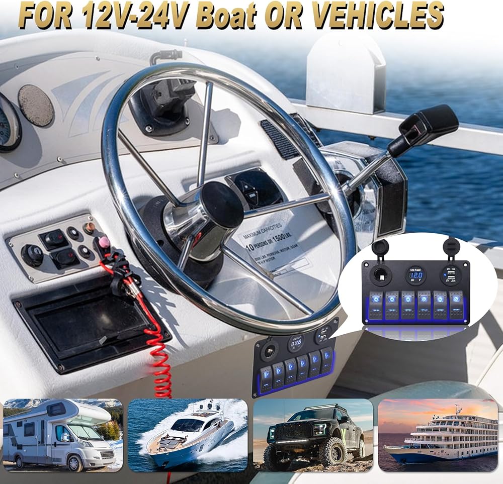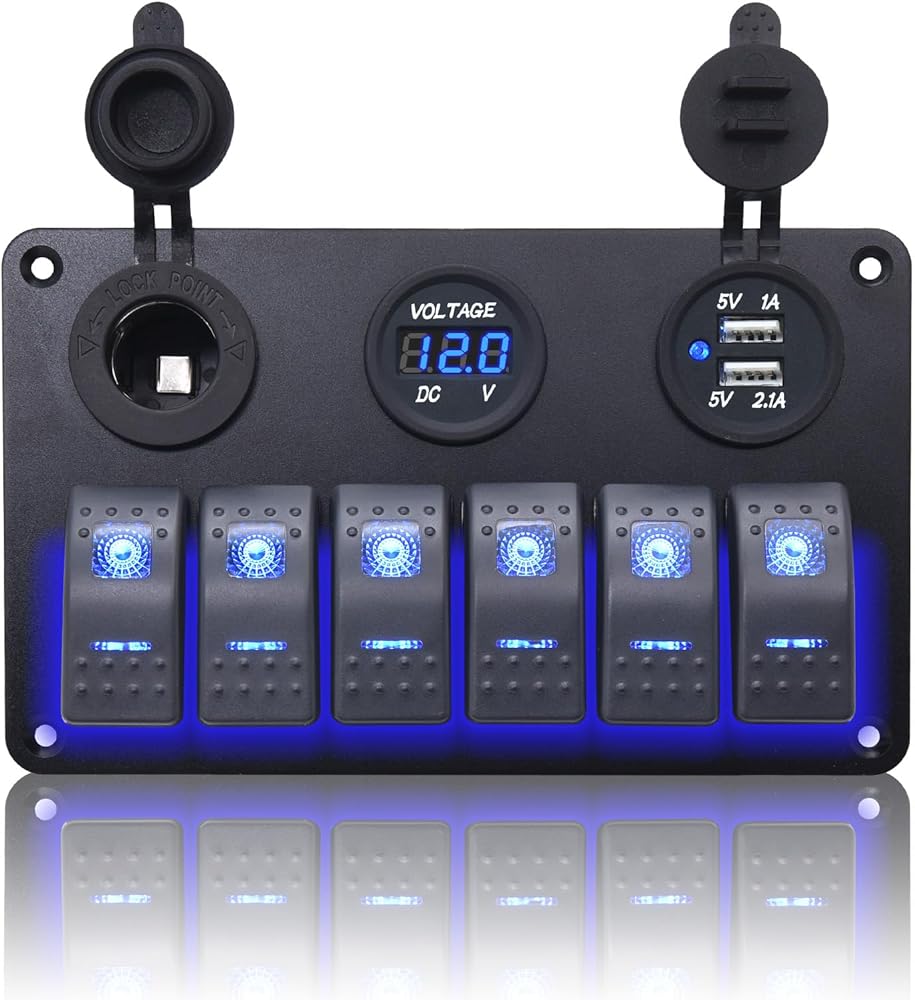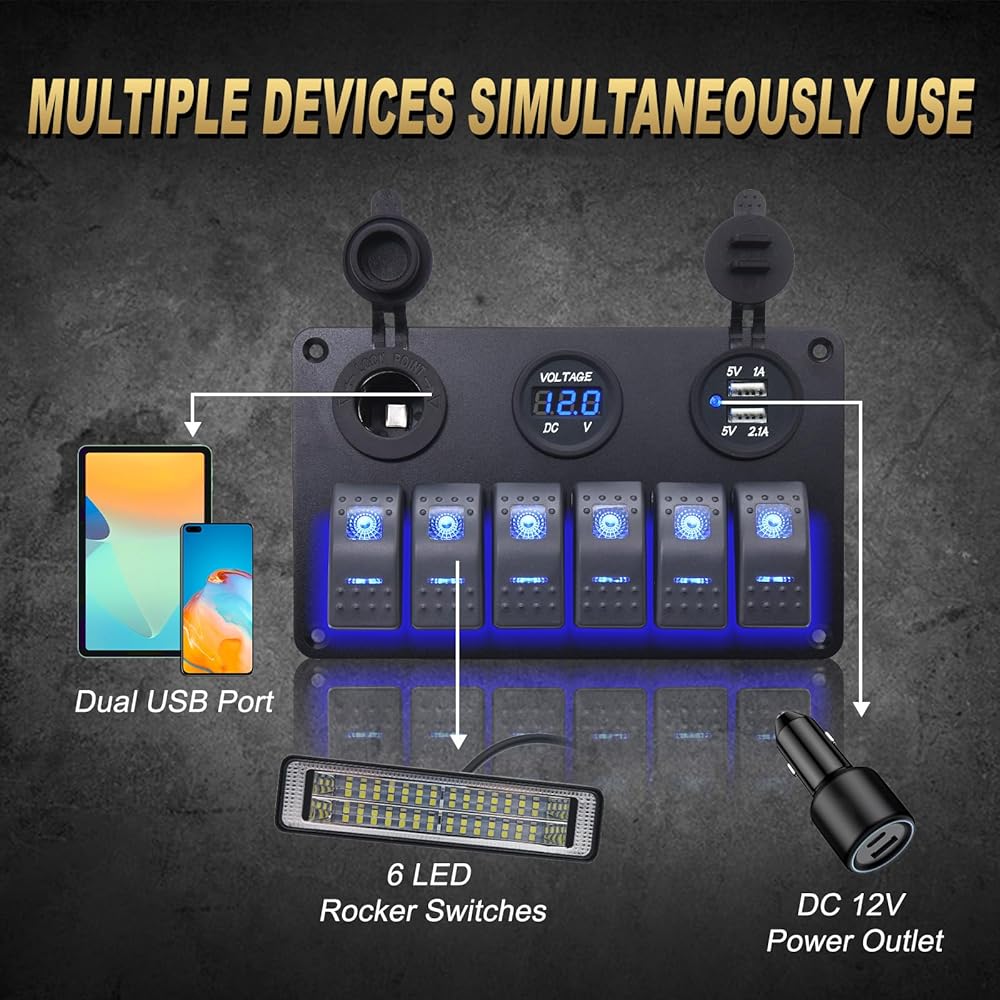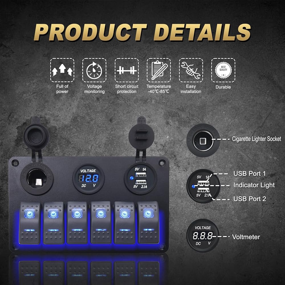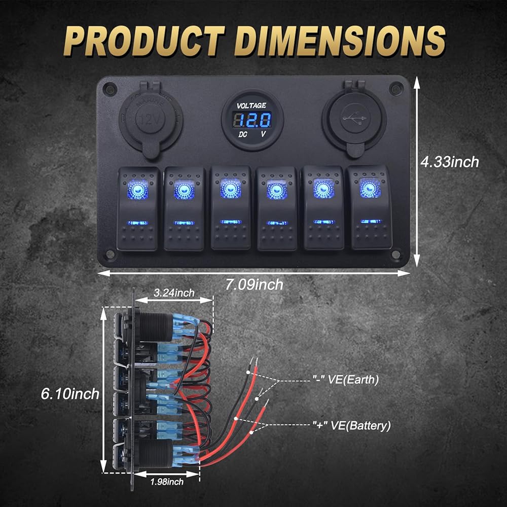【لوحة مفاتيح متعددة الوظائف ذات 6 عصابات】لوحة مفاتيح بحرية مع مقابس USB3.2A مزدوجة، ومصباح LED أزرق، ومقبس ولاعة سجائر نحاسي 12 فولت. تستخدم على نطاق واسع مع القوارب واليخوت والسيارات وسيارات الدفع الرباعي والمركبات الترفيهية والشاحنات وما إلى ذلك. يمكن استخدامه أيضًا للتحكم في المفاتيح الكهربائية المنزلية.