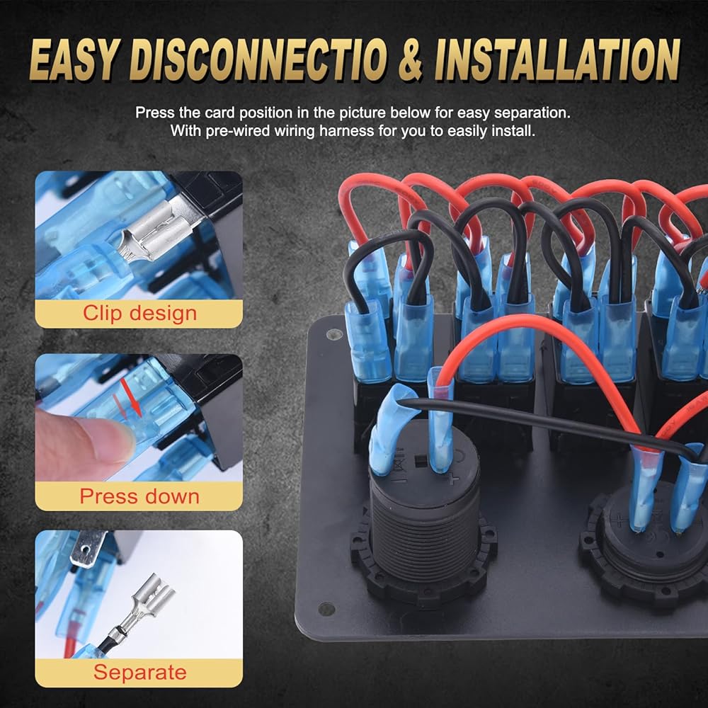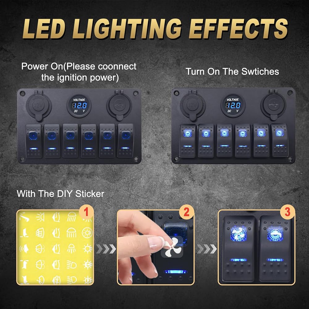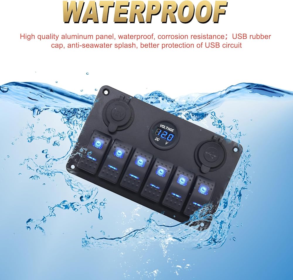 【مادة عالية الجودة】لوحة مفاتيح القارب مصنوعة من لوحة ألومنيوم عالية الجودة، ومقاومة للماء IP66، ومتينة، ومقاومة للتآكل. مفتاح ABS عالي الجودة مثبطات اللهب، أداء جيد للسلامة. تم تجهيز مقبس USB ولاعة السجائر بأغطية مانعة للتسرب للحماية ومقاومة للماء.